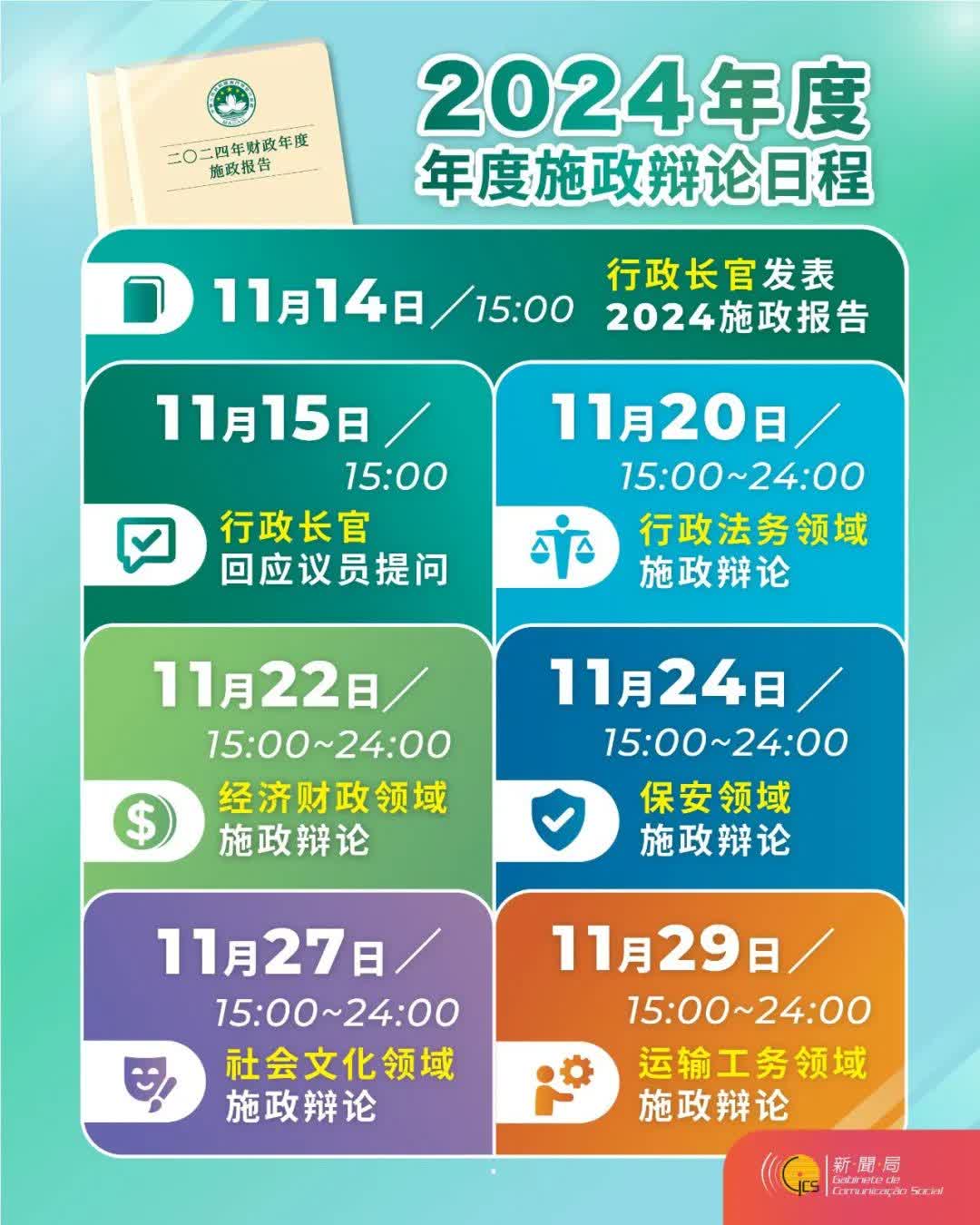 據澳門特區官方消息,澳門行政長官賀一誠將於11月14日下午3時在立法會發表《2024年財政年度施政報告》,並於同日下午5時30分在政府總部舉行新聞發布會,就施政報告內容回答記者提問。賀一誠於翌(15)日下午3時列席立法會全體會議,回應議員關於2024年度施政報告的提問。