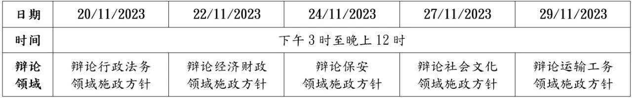 至於各領域施政方針的立法會辯論會議,日程分別是:11月20日辯論行政法務領域、22日辯論經濟財政領域、24日辯論保安領域、27日辯論社會文化領域,以及29日辯論運輸工務領域施政方針。