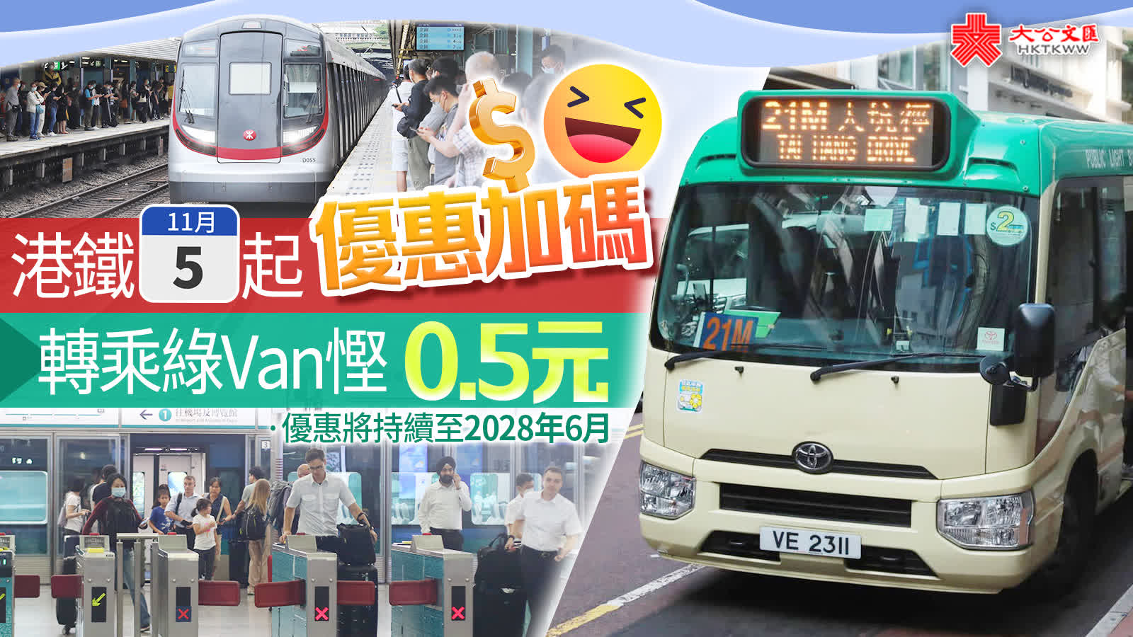 大公文匯全媒體報道,早前,港鐵票價調整機制新方案出爐,綠色專線小巴轉乘港鐵優惠將由每程0.3元增至每程0.5元,覆蓋全港500多條路線。港鐵今日(11月1日)宣布,綠色專線小巴轉乘優惠將由本月5日起「加碼」至每程0.5元,覆蓋全港所有綠色專線小巴路線,優惠將持續至2028年6月。