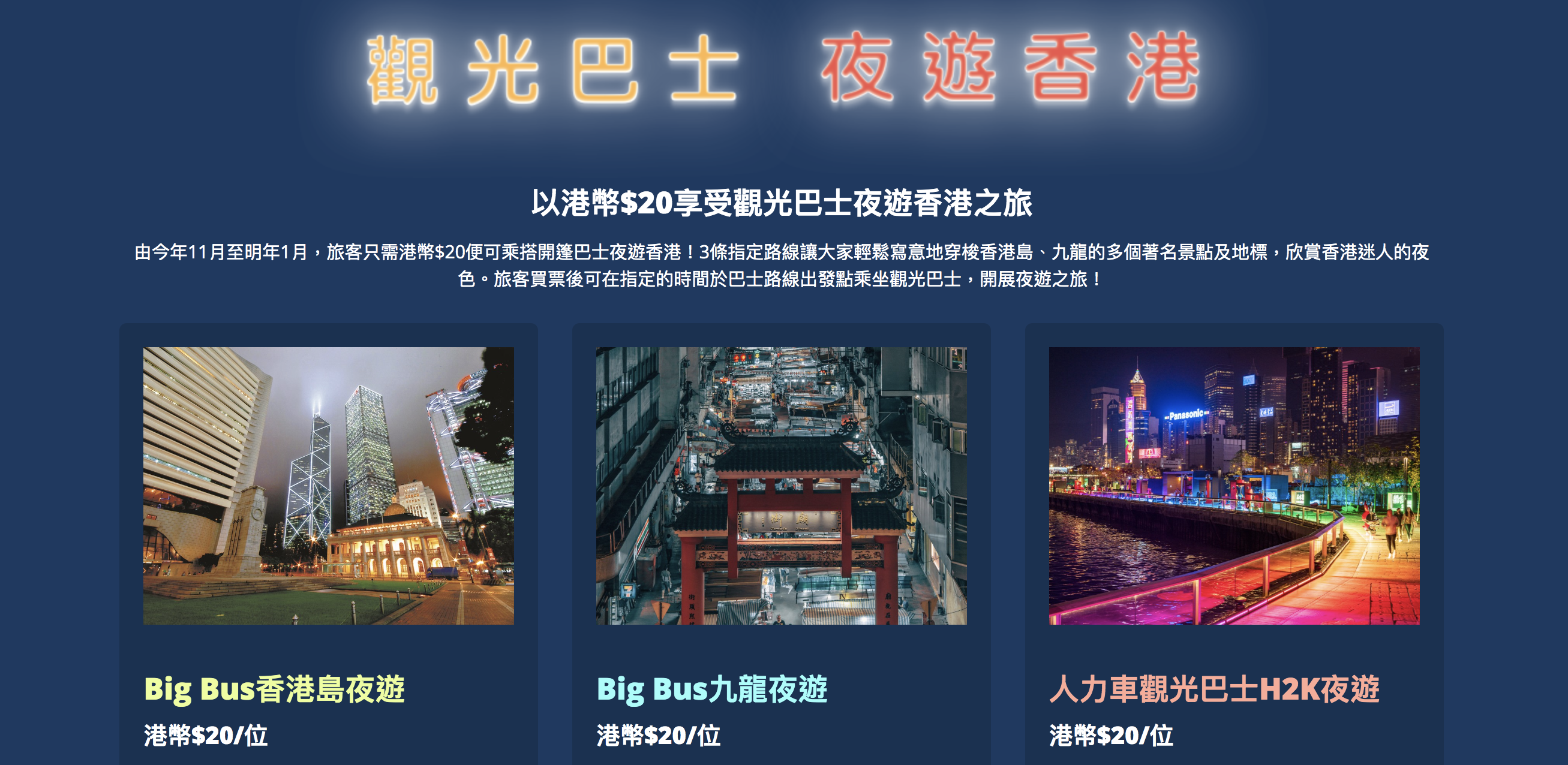 明日(11月2日)至明年1月期間,旅客於傍晚6時半後,只需港幣20元,便可乘搭3條觀光巴士指定路線,享受夜遊香港之旅,輕鬆寫意地穿梭香港島﹑九龍多個著名景點及地標,欣賞香港迷人的夜色景致。(點此了解詳情)