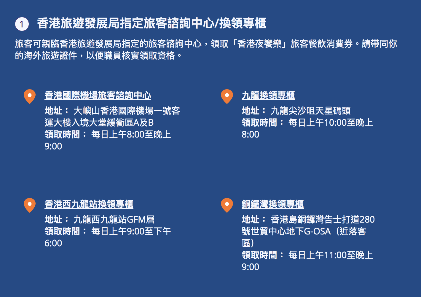 旅客抵港後,可在以下地點領取「香港夜饗樂」- 旅客餐飲消費劵: