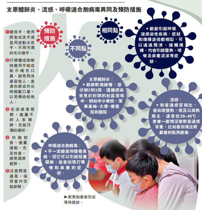 上述場景在浙江、福建等省份也陸續發生,不少患者還出現了混合感染。杭州市第一人民醫院兒科病房一直處於滿床排隊狀態,該院門診醫生最多一天要看100多名患兒。同時,最近甲流、乙流感染患兒明顯增多,每10個做流感檢查的患兒裏有三四個陽性,其中部分患兒同時感染肺炎支原體。