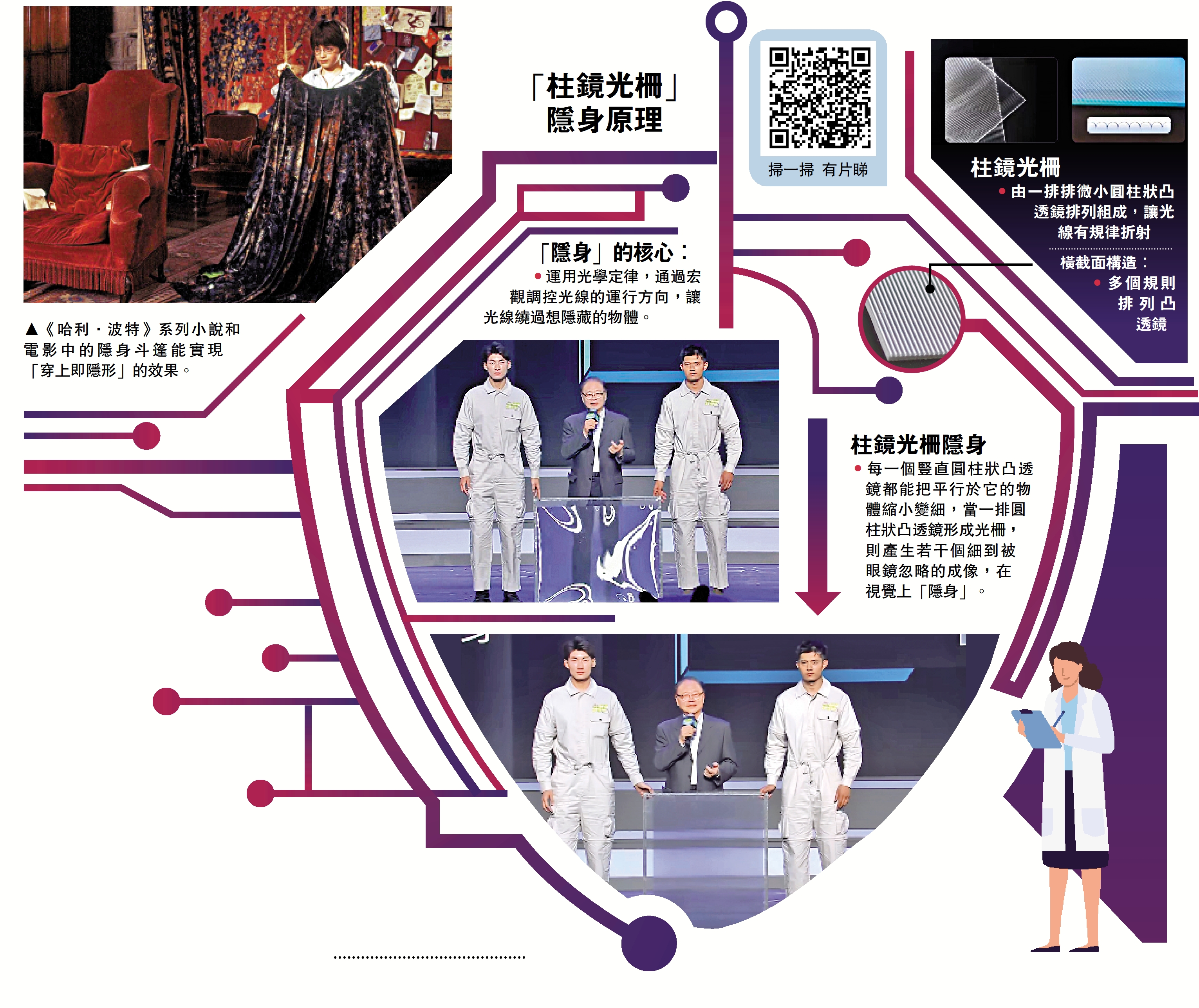 此次褚君浩在舞台上展示的「隱身術」,最大的「功臣」是名為「柱鏡光柵」的材料,「柱鏡光柵」是由一排排微小的圓柱狀凸透鏡排列組成,每一個豎直圓柱狀凸透鏡都能把平行於它的物體縮小變細,這也意味着,在特定的角度中,「柱鏡光柵」利用光的折射原理,將對應物體的光無限折射成一條線,「就好像百褶簾上的圖案一樣,當百褶簾換一個角度後就會變為一條條細線,百褶簾上的圖案也就看不見了,『柱鏡光柵』也就是通過光的折射,將藏在它後的物體無限『擠壓』成一條條細線,自然我的半身就『消失』看不見了。」