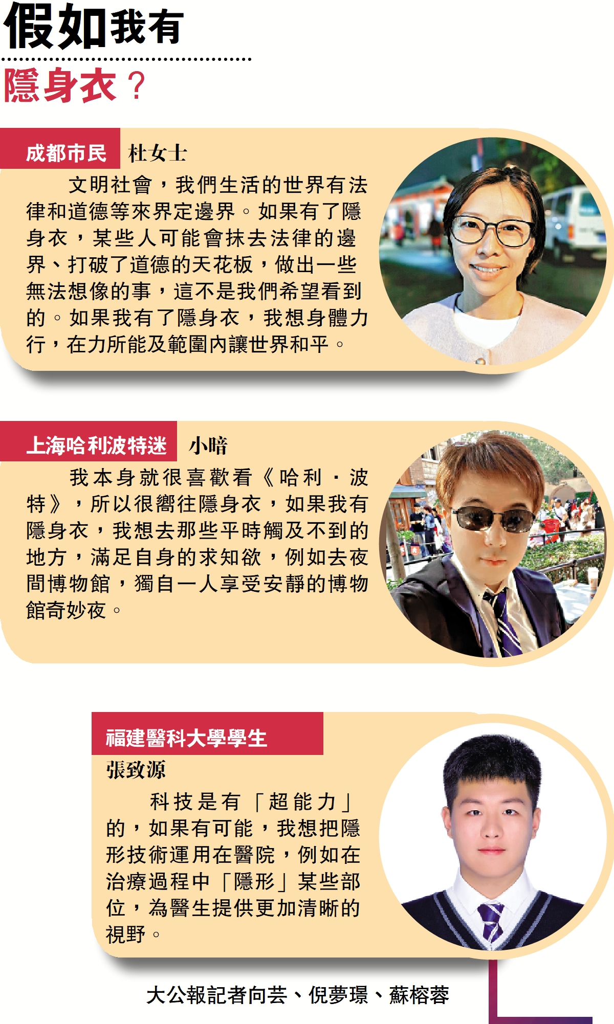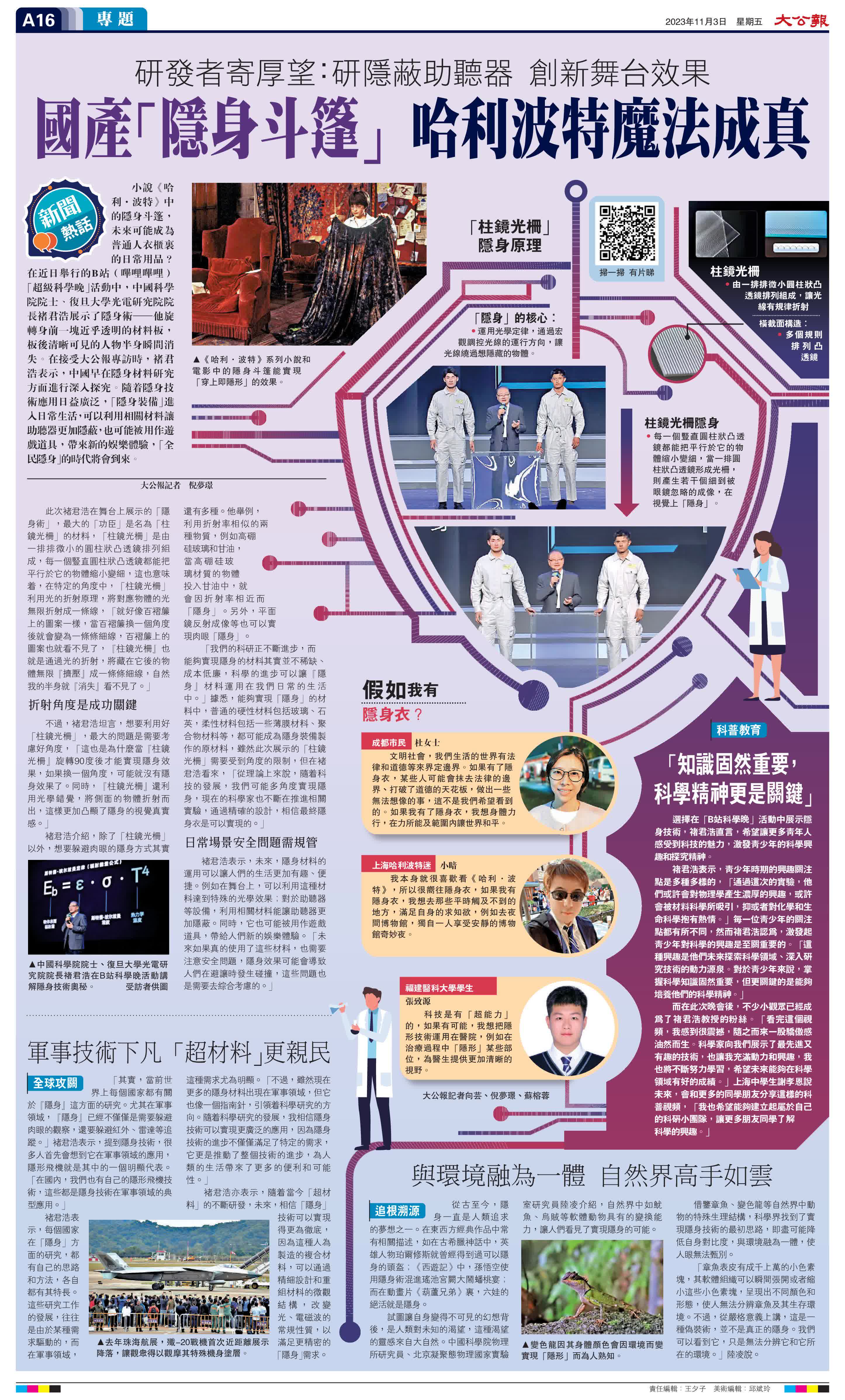 (大公報記者 倪夢璟)小說《哈利·波特》中的隱身斗篷,未來可能成為普通人衣櫃裏的日常用品?在近日舉行的B站(嗶哩嗶哩)「超級科學晚」活動中,中國科學院院士、復旦大學光電研究院院長褚君浩展示了隱身術——他旋轉身前一塊近乎透明的材料板,板後清晰可見的人物半身瞬間消失。在接受大公報專訪時,褚君浩表示,中國早在隱身材料研究方面進行深入探究。隨着隱身技術應用日益廣泛,「隱身裝備」進入日常生活,可以利用相關材料讓助聽器更加隱蔽,也可能被用作遊戲道具,帶來新的娛樂體驗,「全民隱身」的時代將會到來。