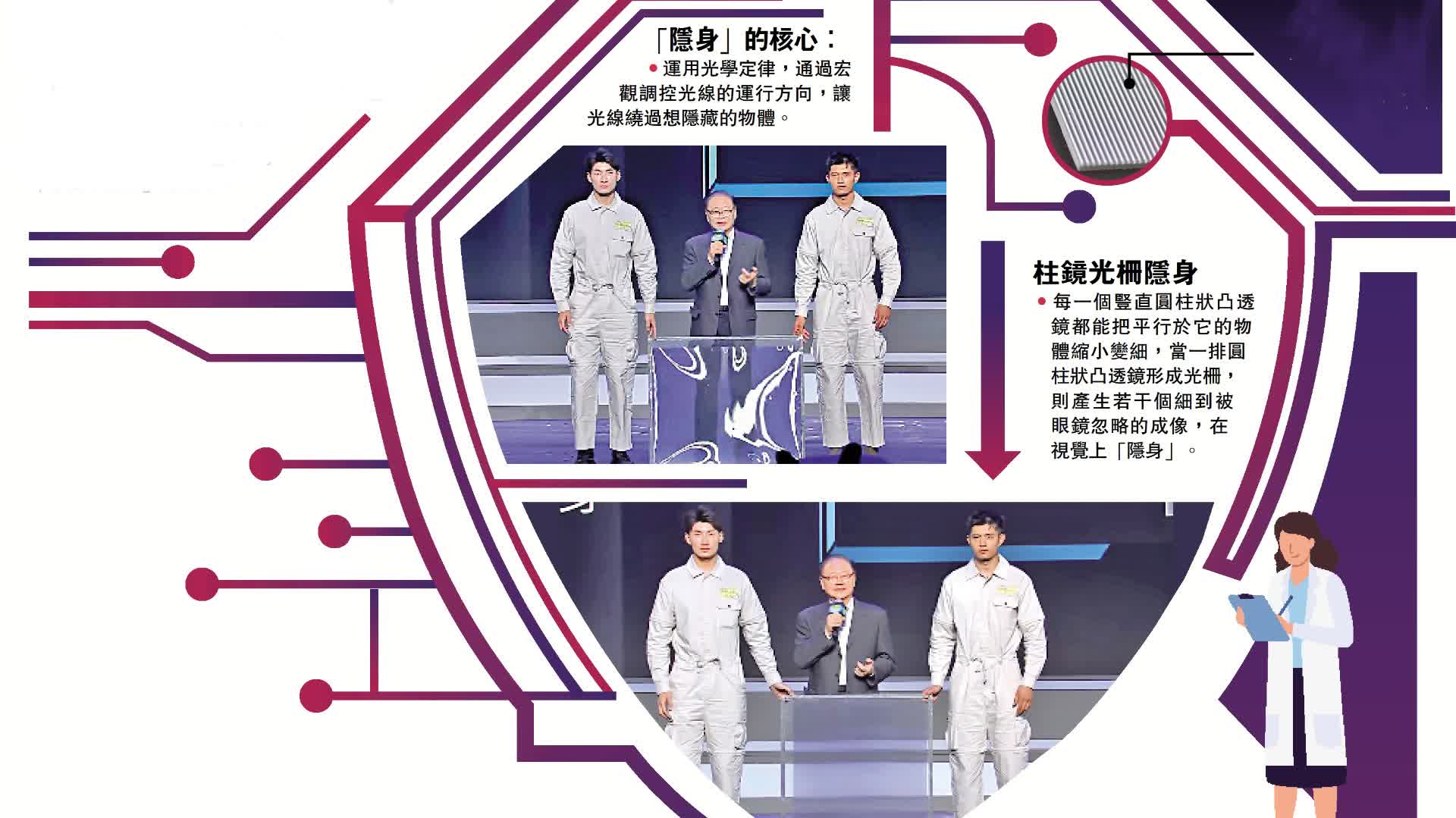不過,褚君浩坦言,想要利用好「柱鏡光柵」,最大的問題是需要考慮好角度,「這也是為什麼當『柱鏡光柵』旋轉90度後才能實現隱身效果,如果換一個角度,可能就沒有隱身效果了。同時,『柱鏡光柵』還利用光學錯覺,將側面的物體折射而出,這樣更加凸顯了隱身的視覺真實感。」