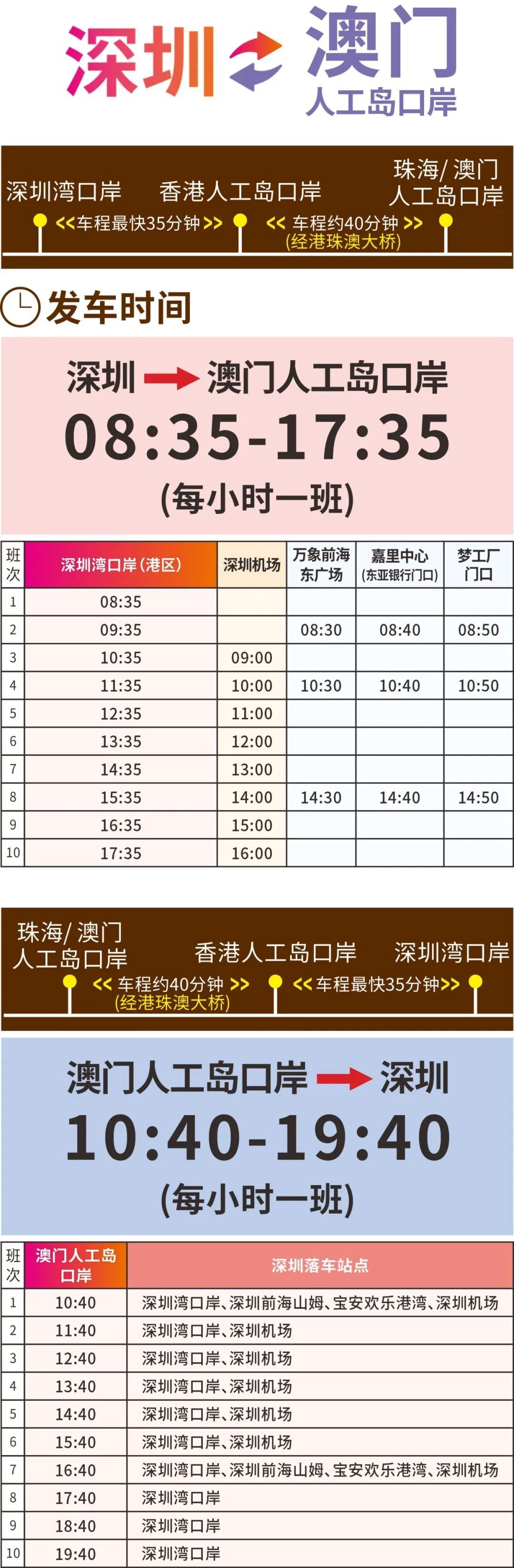 澳門人工島口岸→深圳灣:澳門口岸過關後左手邊A區車通道上車,到達港珠澳大橋(香港口岸)下車過關,入境香港後乘坐大巴(過關後右手邊玻璃門出去6號車位上車),到達深圳灣口岸。