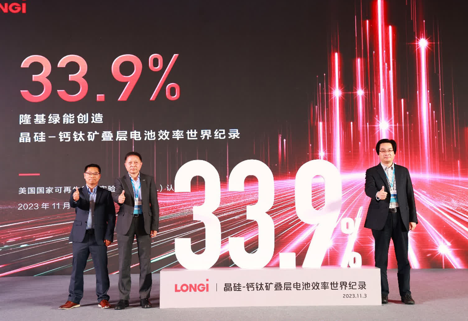 (大公文匯網 記者 李陽波 西安報道)太陽能電池轉換效率主要是指太陽光裝換為電能的百分比,被譽為光伏技術的燈塔,它的極限效率決定和展示了光伏技術發展潛力和光伏產業的發展方向。11月3日,據美國國家可再生能源實驗室(NREL)最新認證報告顯示,由中國光伏龍頭企業——隆基綠能科技股份有限公司自主研發的晶硅-鈣鈦礦疊層電池效率達到33.9%,這也是目前全球晶硅-鈣鈦礦疊層電池效率的最高紀錄。當日,隆基綠能在陝西西安正式發布了這一消息。據悉,此前該電池效率的世界紀錄是33.7%,由沙特國王科技大學於今年5月份突破。