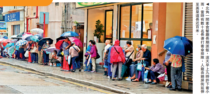 再隔一天,星期四上午9時許,記者又來到北角,當日下着小雨,離派飯還有一小時,長者們有的打傘、有的拉起風衣的帽,在素食店門前排隊。這一天會派發100個飯盒,接近派飯時間,人龍由錦屏街延伸至英皇道,足足百米,全部都是白髮蒼蒼的年邁長者,較為體弱的撐着枴杖、蹣跚而至。
