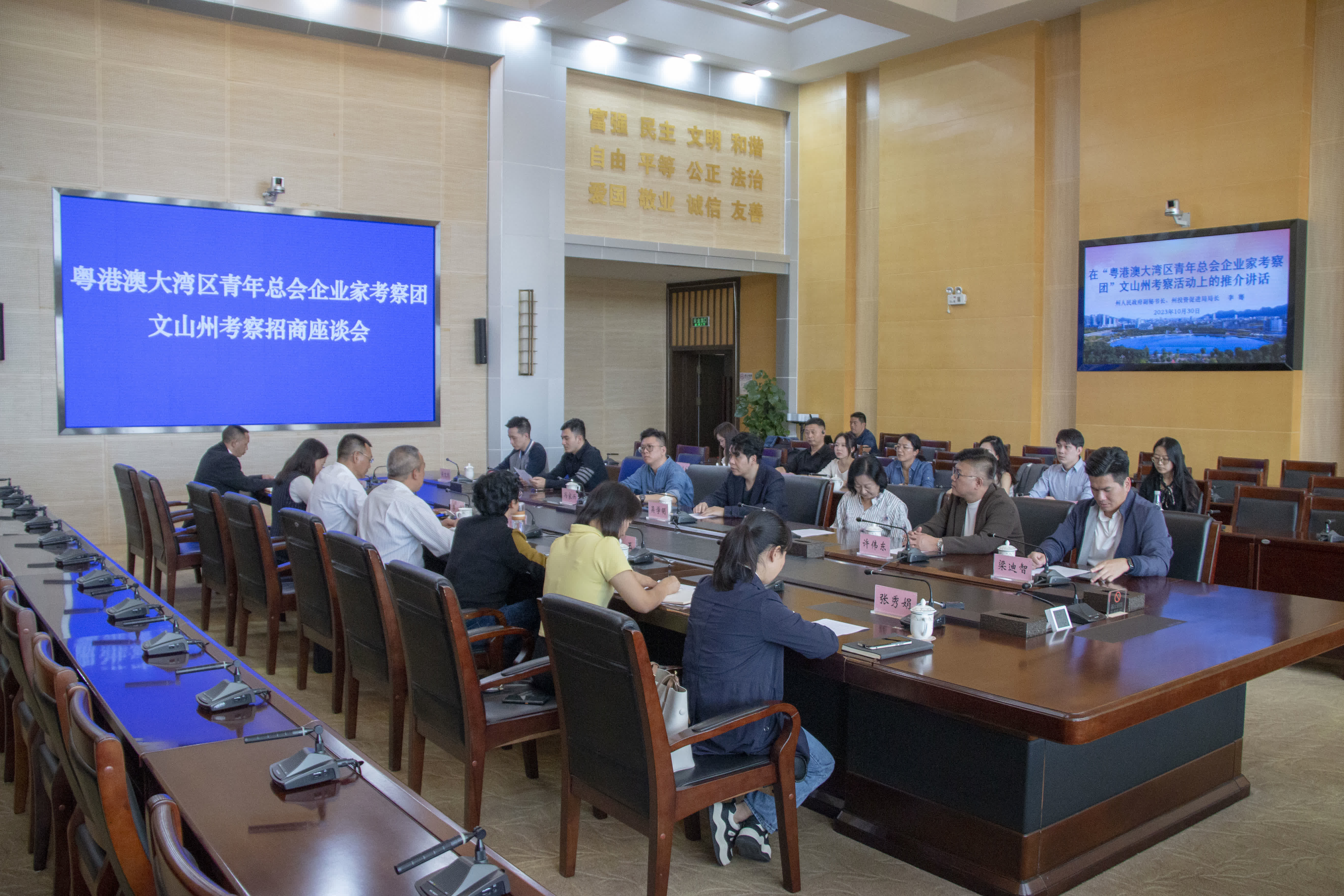 其後,考察團一行出席在文山州政府舉行的招商座談會。文山市是世界唯一的三七產業、綠色鋁全產業鏈、礦產資源豐富的資源優勢以及輻射三個國家級口岸、承載全州教育、醫療、消費的州府優勢集中顯現。團員們在會上均表示雲南處處是寶藏,並認為這裡有著無限的發展潛力。