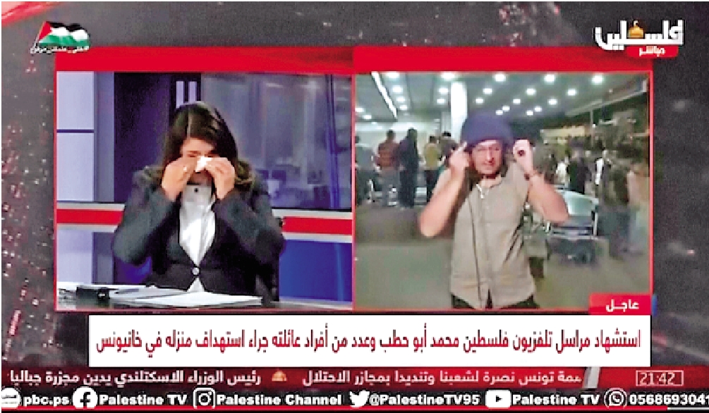 當地時間2日,巴勒斯坦電視台記者哈塔卜及其10名家人,在加沙南部汗尤尼斯的家中被炸死。噩耗傳來,哈塔卜的同事,正在連線直播的巴勒斯坦電視台主持人和戰地記者雙雙情緒崩潰,兩人對着鏡頭難掩悲憤。