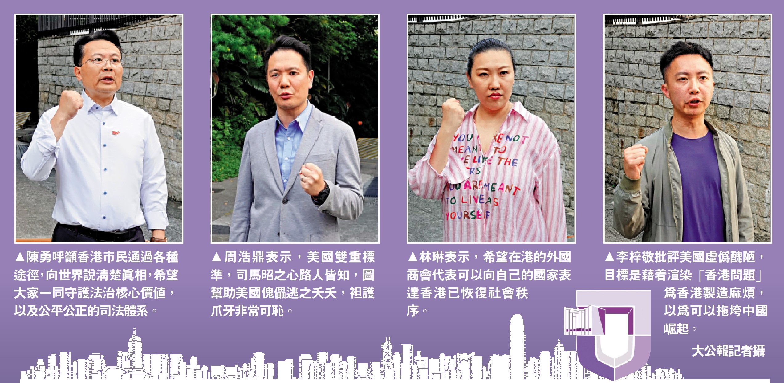 港區全國人大代表、立法會議員、民建聯副主席陳勇代表民建聯譴責美國的惡行。他說,香港各界市民對他表示十分憤慨,見到美國很多政客顛倒是非黑白,破壞法律核心價值,不少市民形容他們「只許自己放火,不許他人點燈」,只想將香港變得更加混亂。他表示,「制裁名單」上的法官及官員忠誠、公平、正義,相信他們面對所謂「制裁」亦無所畏懼,會繼續維護和守護香港的法治,期望向全世界講清楚事實。他說,不少國家的政要領袖和市民都會抗議美國政客的這種偏幫,他相信正義在人間,正義屬於香港。他呼籲香港市民通過各種途徑,向世界說清楚真相,希望大家一同守護法治核心價值,以及公平公正的司法體系。