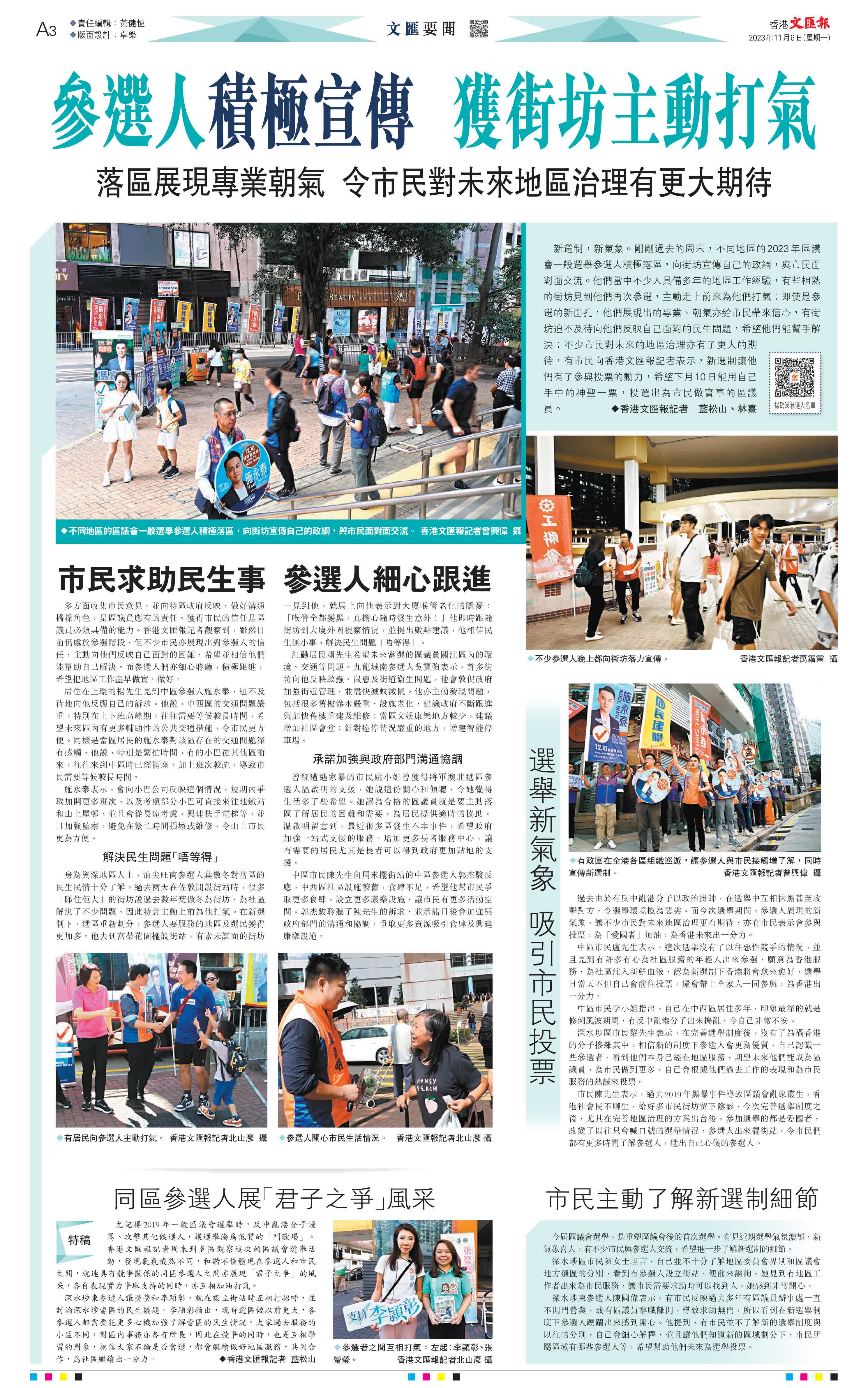 (香港文匯報記者 藍松山 林熹)新選制,新氣象。剛剛過去的周末,不同地區的2023年區議會一般選舉參選人積極落區,向街坊宣傳自己的政綱,與市民面對面交流。他們當中不少人具備多年的地區工作經驗,有些相熟的街坊見到他們再次參選,主動走上前來為他們打氣;即使是參選的新面孔,他們展現出的專業、朝氣亦給市民帶來信心,有街坊迫不及待向他們反映自己面對的民生問題,希望他們能幫手解決;不少市民對未來的地區治理亦有了更大的期待,有市民向香港文匯報記者表示,新選制讓他們有了參與投票的動力,希望下月10日能用自己手中的神聖一票,投選出為市民做實事的區議員。
