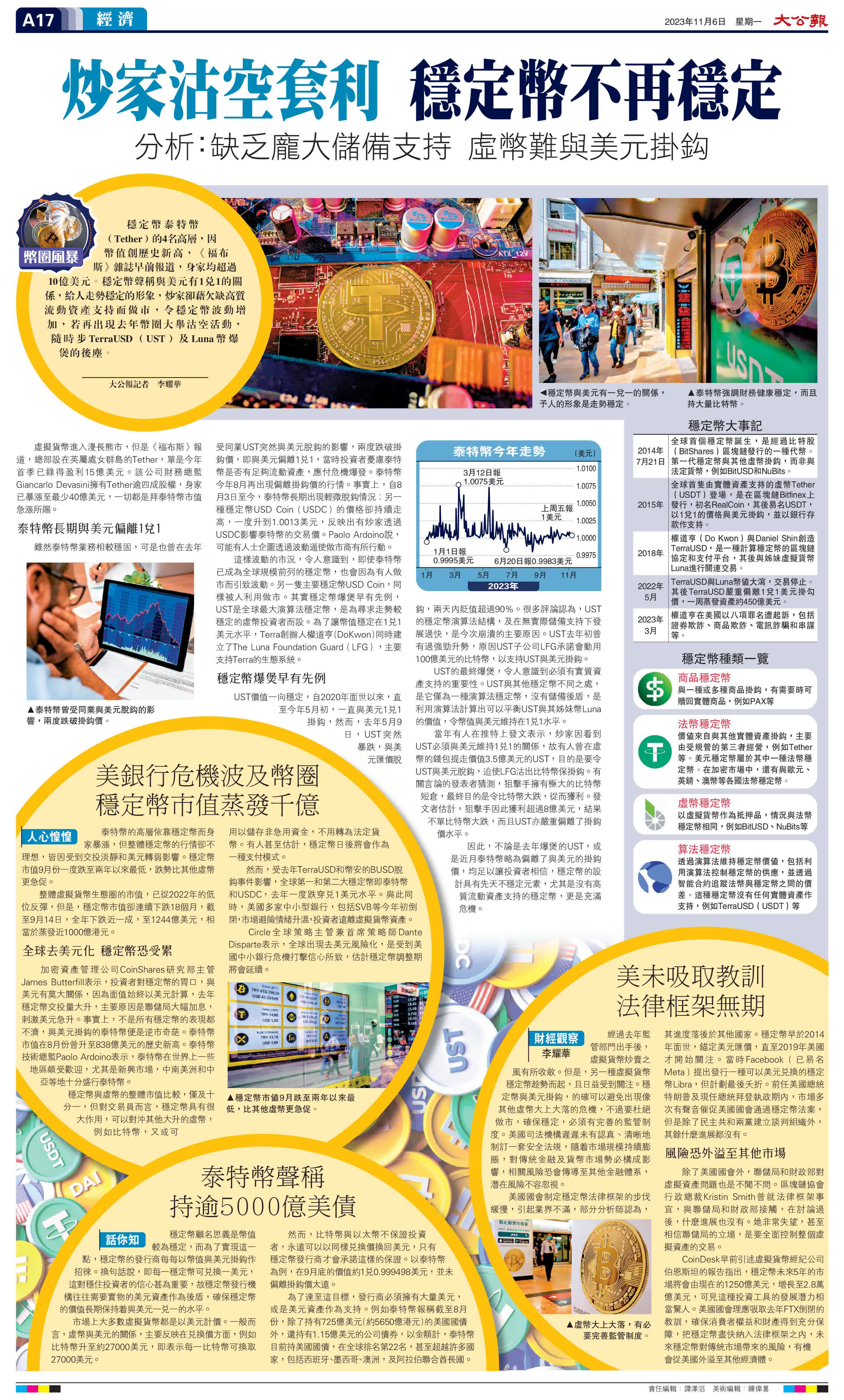 CoinDesk早前引述虛擬貨幣經紀公司伯恩斯坦的報告指出,穩定幣未來5年的市場將會由現在的1250億美元,增長至2.8萬億美元,可見這種投資工具的發展潛力相當驚人。美國國會理應吸取去年FTX倒閉的教訓,確保消費者權益和財產得到充分保障,把穩定幣盡快納入法律框架之內,未來穩定幣對傳統市場帶來的風險,有機會從美國外溢至其他經濟體。