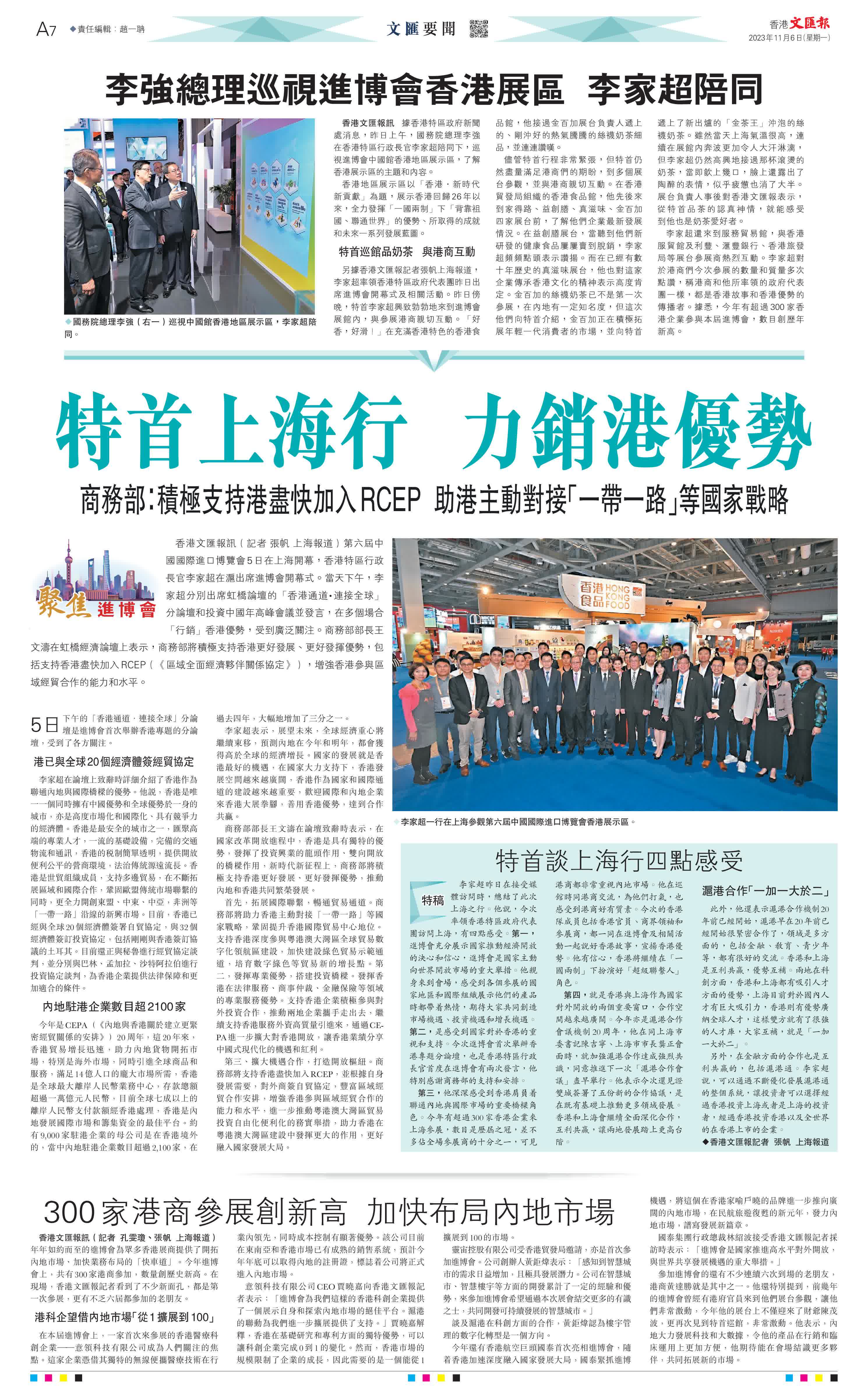 (香港文匯報記者 張帆 上海報道)第六屆中國國際進口博覽會5日在上海開幕,香港特區行政長官李家超在滬出席進博會開幕式。當天下午,李家超分別出席虹橋論壇的「香港通道·連接全球」分論壇和投資中國年高峰會議並發言,在多個場合「行銷」香港優勢,受到廣泛關注。商務部部長王文濤在虹橋經濟論壇上表示,商務部將積極支持香港更好發展、更好發揮優勢,包括支持香港盡快加入RCEP(《區域全面經濟夥伴關係協定》),增強香港參與區域經貿合作的能力和水平。