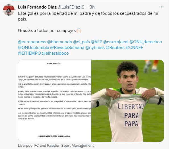 迪亞斯也在這場比賽後更新了社交媒體動態。針對自己的父親仍然被綁架,他說:「這粒進球是獻給我爸爸以及所有在我國被綁架的人的自由。」