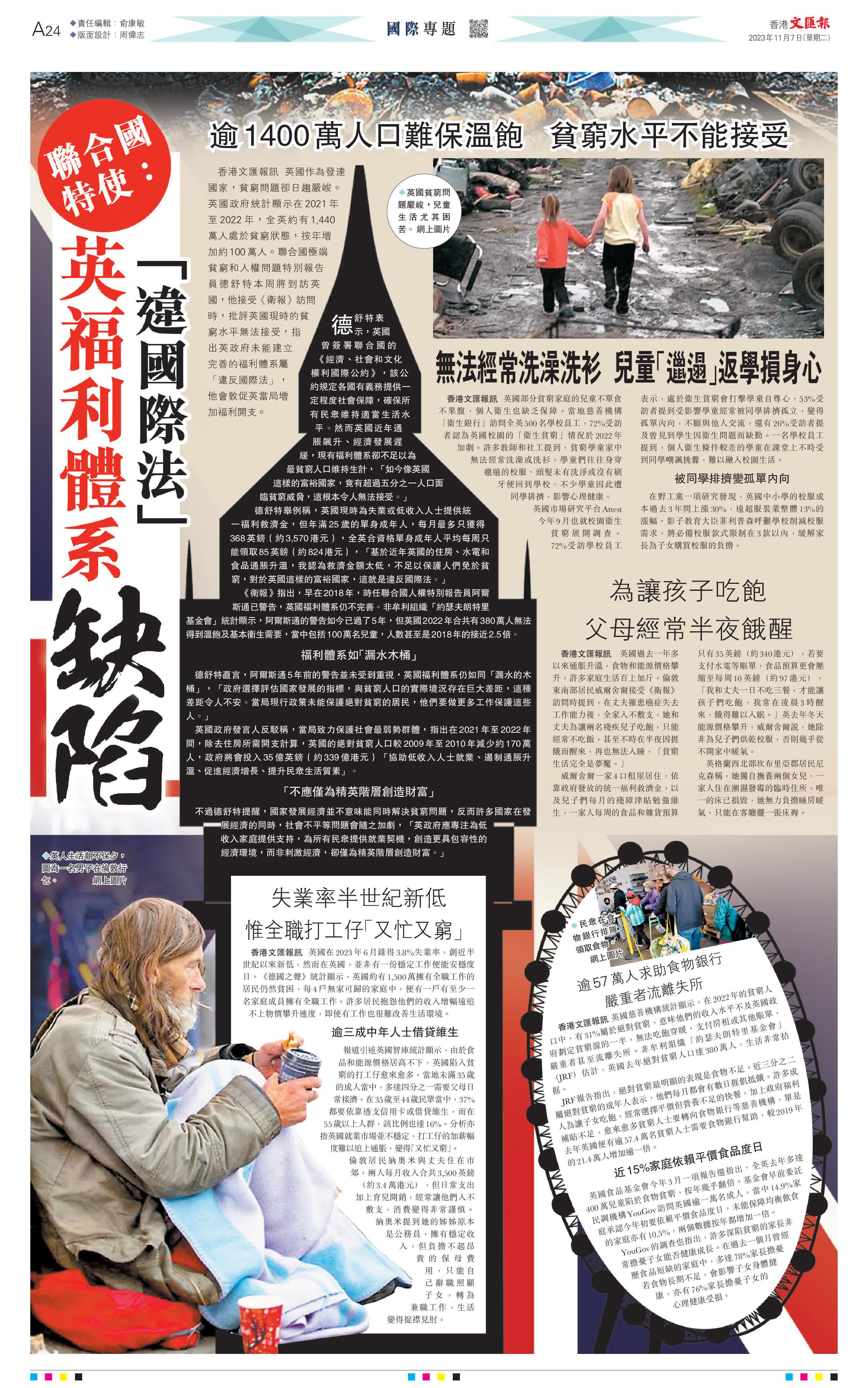 香港文匯報報道,英國作為發達國家,貧窮問題卻日趨嚴峻。英國政府統計顯示在2021年至2022年,全英約有1,440萬人處於貧窮狀態,按年增加約100萬人。聯合國極端貧窮和人權問題特別報告員德舒特本周將到訪英國,他接受《衛報》訪問時,批評英國現時的貧窮水平無法接受,指出英政府未能建立完善的福利體系屬「違反國際法」,他會敦促英當局增加福利開支。