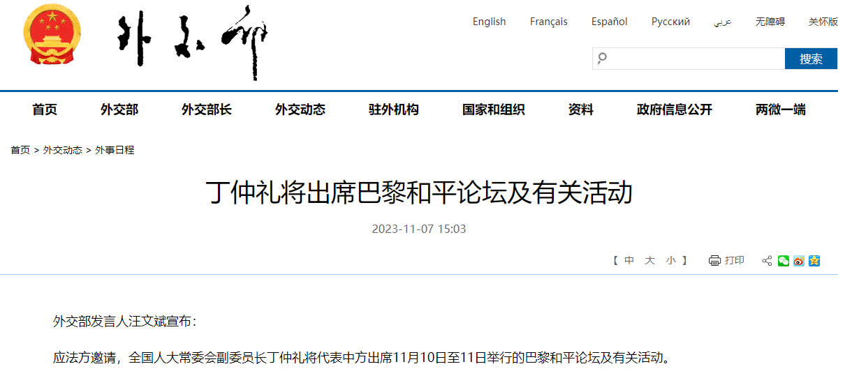 據外交部網站消息,外交部發言人汪文斌宣布:應法方邀請,全國人大常委會副委員長丁仲禮將代表中方出席11月10日至11日舉行的巴黎和平論壇及有關活動。