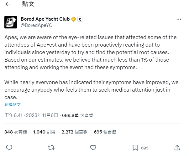 無聊猿及後發文表示,得悉盛會部分參加者眼睛出現問題,周日(5日)開始已主動聯繫相關人士,找出根本原因。根據無聊猿估計,參加者之中只有不足1%出現這些症狀。無聊猿又稱,幾乎每個人都表示他們的症狀已經改善,但亦鼓勵任何出現症狀的人士求醫。報道指,共有約2250人參加涉事活動。
