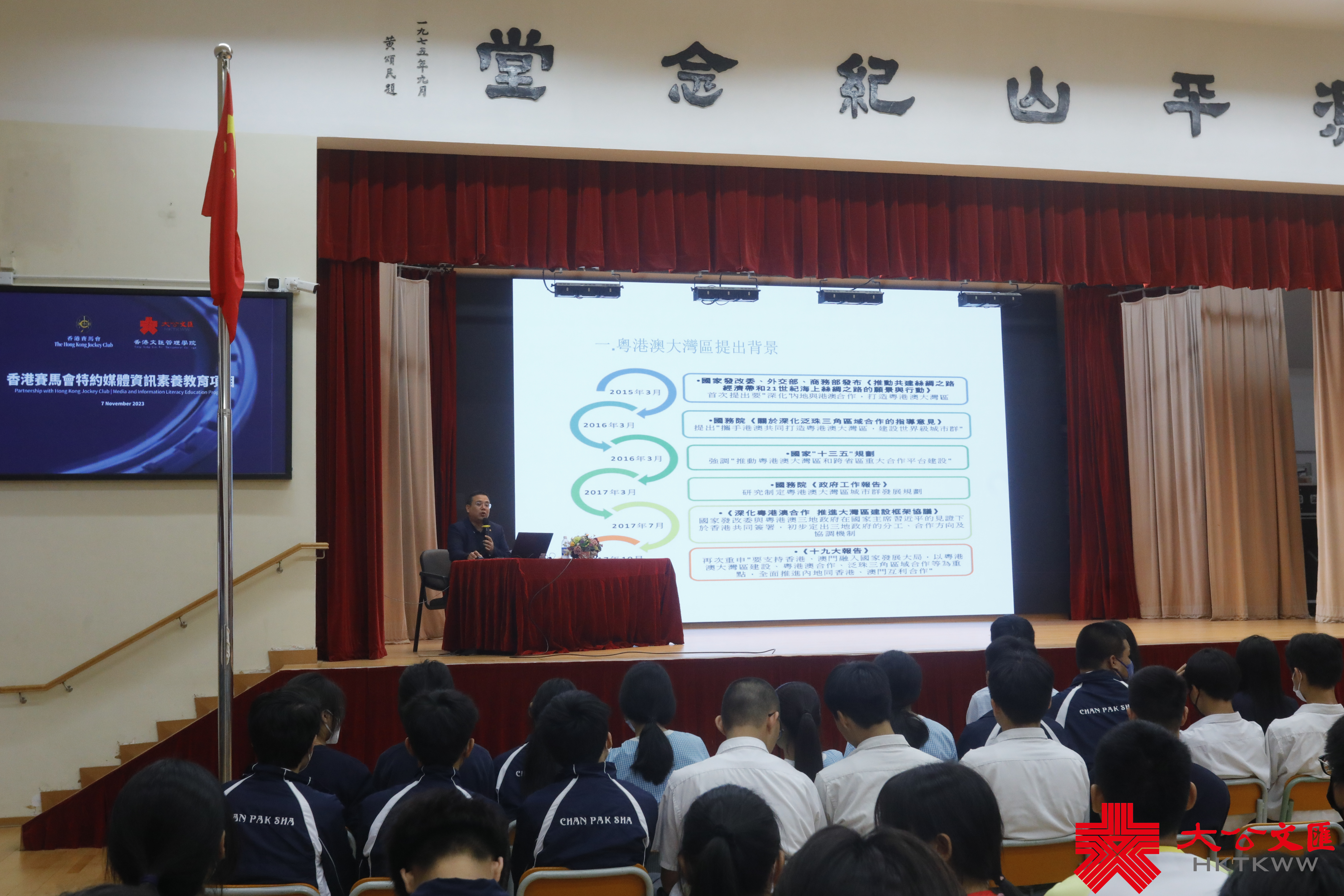 (大公文匯全媒體 記者 王俊傑)「同學們,提到粵港澳大灣區,你會聯想起什麼?是各城市的獨特文化?抑或是職業發展?」繼10月參觀香港大公文匯傳媒集團之後,由香港賽馬會贊助的「香港賽馬會特約媒體資訊素養教育項目」今日(7日)來到第二期到校講座,香港文匯管理學院特約講師特地選擇近年國家熱話——粵港澳大灣區建設與發展新機遇,與新會商會陳白沙紀念中學一眾學生共同探討。