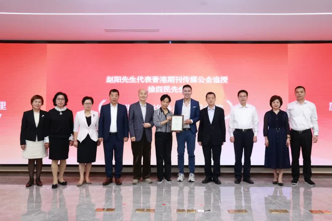 座談會上還舉行了「香港期刊終身成就紀念獎」追授儀式。徐四民為「一國兩制」事業在香港的生動實踐,為祖國的和平統一做出了重要貢獻。1977年,他秉承「誠實敢言、振興中華」的宗旨,創辦《鏡報》月刊,親自撰寫發表多篇政論文章,較好實踐了期刊傳媒作為社會公器的擔當,成為香港期刊界的先鋒與表率。為紀念徐四民先生赤誠愛國、精闢敢言的一生,進一步激勵廣大香港期刊傳媒工作者「鐵肩擔道義,妙手著文章」,香港期刊傳媒公會特別追授徐四民先生以「香港期刊終身成就紀念獎」。全國政協參政議政特聘專家、國務院僑辦原副主任趙陽代表香港期刊傳媒公會進行授牌,徐四民的二女兒、鏡報副董事長徐小英和徐四民外孫吳耿南代表家屬授牌。