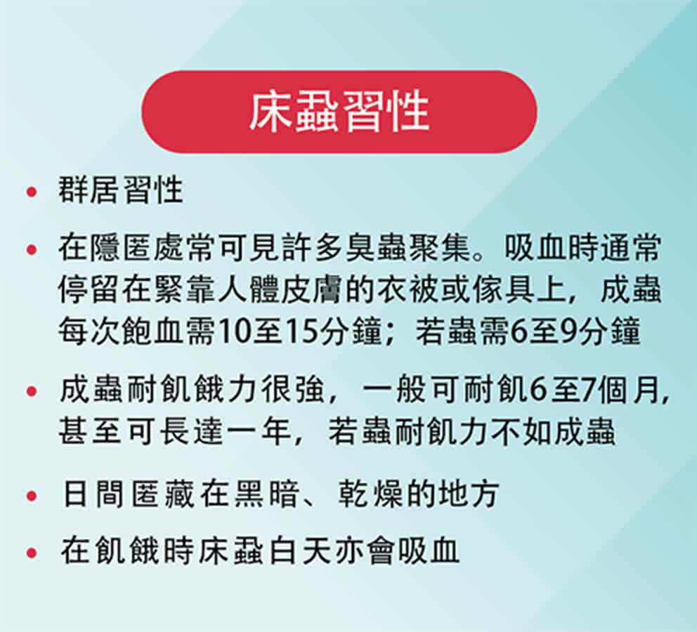 此外,旅客進入房間後,須檢查房間床墊、枕頭、床縫、床周圍以及牆與傢具間的縫隙處,是否有床蝨活動的蹤跡,比如存活或死去的床蝨、蛻皮、蟲卵、被褥上的血漬或氣味。