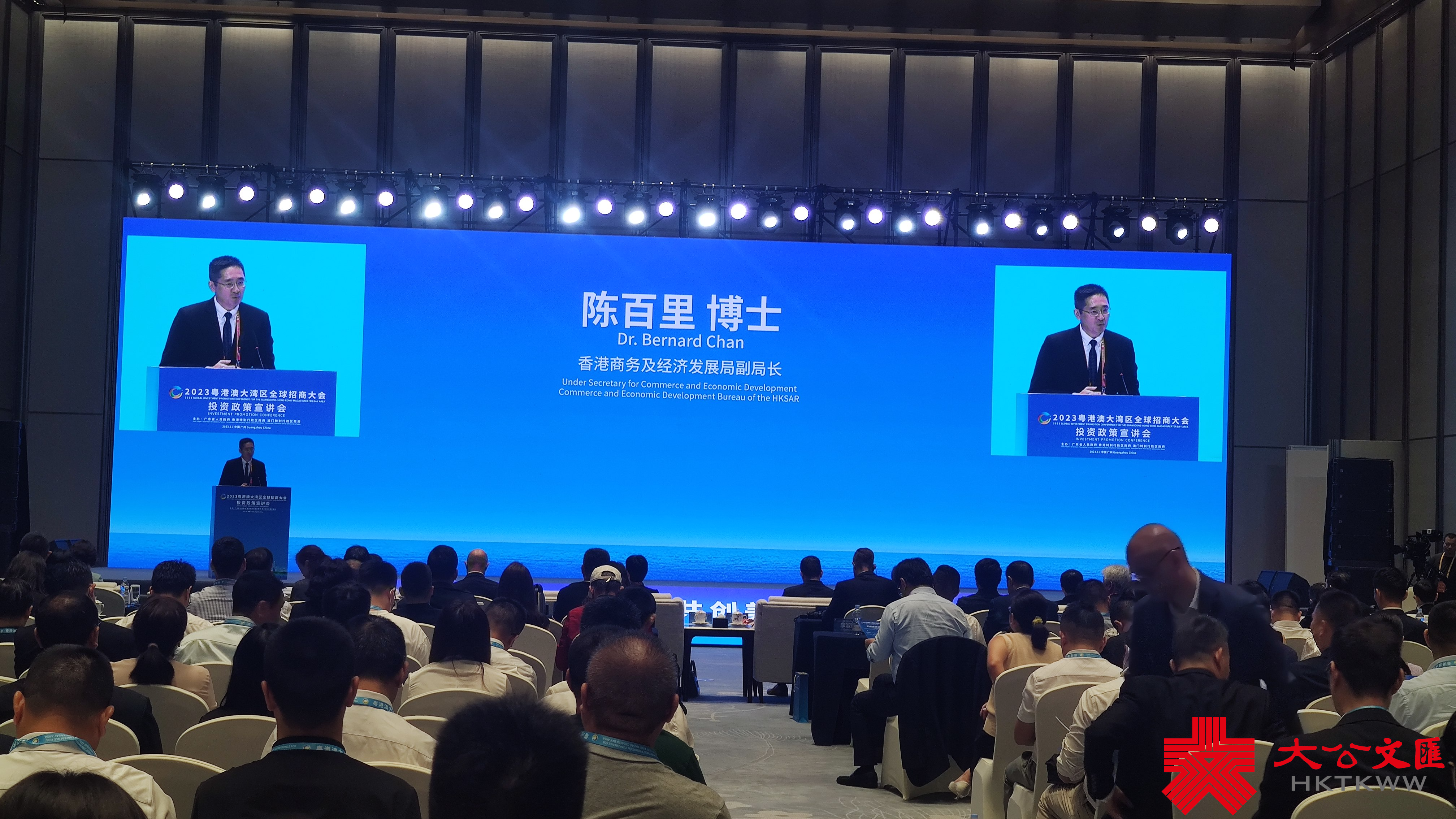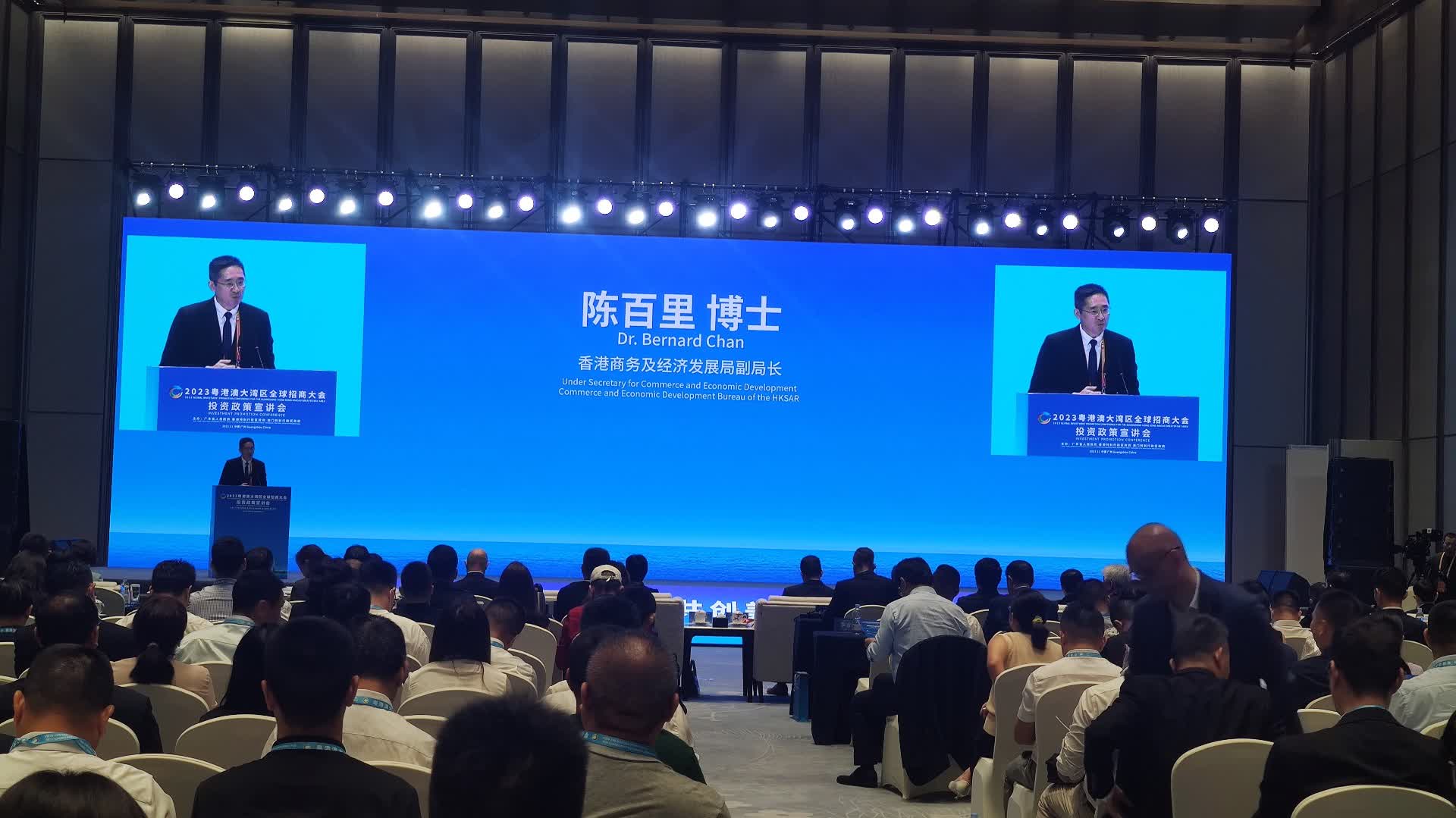 (大公文匯網記者 盧靜怡、敖敏輝)8日,2023粵港澳大灣區全球招商大會投資政策宣講會(省直及港澳專場)在廣州舉行。香港商務及經濟發展局副局長陳百里表示,當前大灣區人口已達8600萬,2022年經濟總量超過1.9萬億美元,相當於全球第十大經濟體。在中央支持下,大灣區實力無限、潛力無限,持續貢獻國家的經濟發展和對外開放。他指出,香港將重點在招商引資領域為大灣區貢獻力量。連同香港貿易發展局和投資推廣署的網絡,香港在全球65個城市設有辦事處,服務範圍覆蓋128個國家。他說:「我們很希望可以用到國際網絡,做好大灣區招商引資的『引進來、走出去』工作。」