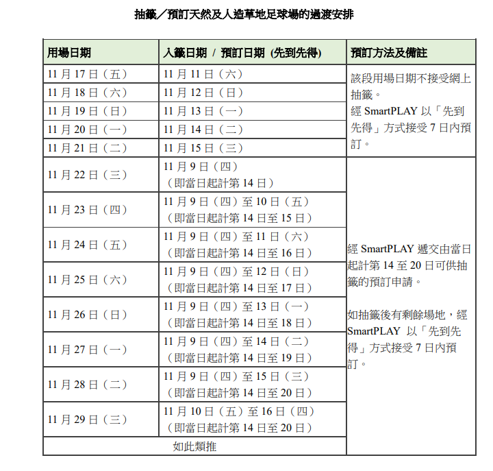 在抽籤/預訂草地足球場方面,SmartPLAY明天啟用後,用戶可於流動應用程式、網上或設置於康樂場地的智能自助服務站遞交抽籤申請預訂由當日起計第14日至20日可供抽籤的草地足球場段節,每份申請可包括三個同一日期的抽籤選項,提交了的申請選項在截止前仍可作更改。如抽籤後有剩餘段節,用戶可以「先到先得」的方式預訂7天內可供租訂的段節。由於系統轉換須實施過渡安排,11月17日至21日的草地足球場段節不接受網上抽籤,用戶可於11月11日至15日期間,以「先到先得」方式預訂即日至七天內可供租訂的段節(即於11月11日預訂當天至11月17日的段節)。