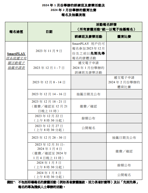 SmartPLAY系統明日推出後,2023年12月份及之前的餘額可於新系統內以「先到先得」方式繼續接受報名。2024年1月份或以後舉辦的訓練班及康樂活動,會統一以抽籤形式接受報名,用戶只需在每月的首7日遞交一份電子抽籤表,便可申請報名參加由18區康樂事務辦事處、水上活動中心、屯門康樂體育中心及綠化運動組於翌月舉辦的活動。至於2024年2月份或以後的比賽,用戶只需於每月第8至14日遞交一份電子抽籤表,便可報名參加兩個月後舉辦的體育比賽,而抽籤安排與訓練班及康樂活動大致相同。