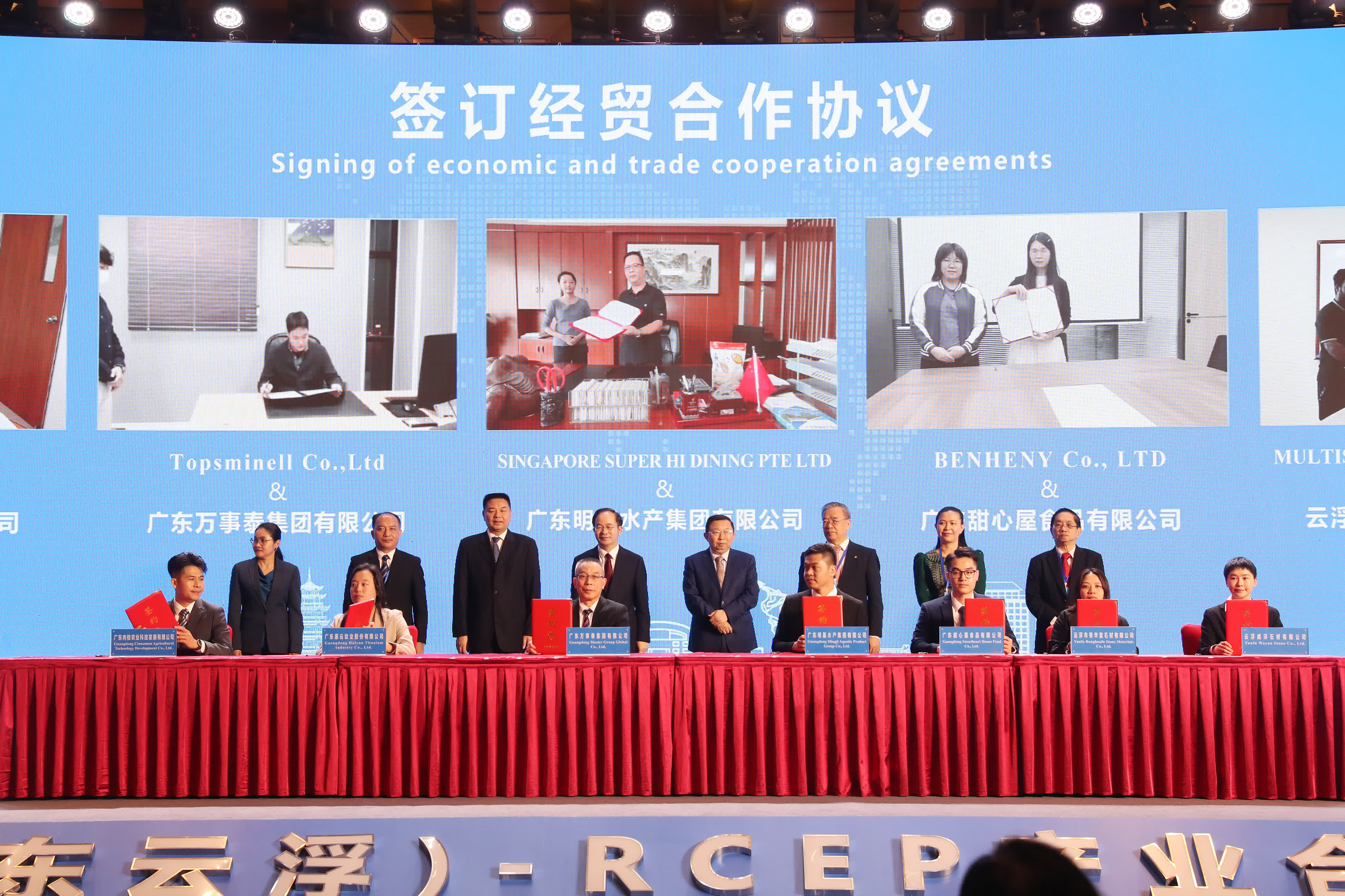 大會期間,雲浮企業還與RCEP成員國有關企業簽訂經貿合作協議。此次簽約採用線上線下同步簽約的方式,包括馬來西亞、新加坡、韓國、柬埔寨4個國家的7家企業,涵蓋肉桂、化工、不鏽鋼、預製菜、涼果、石材等行業,簽約金額超10億元人民幣。