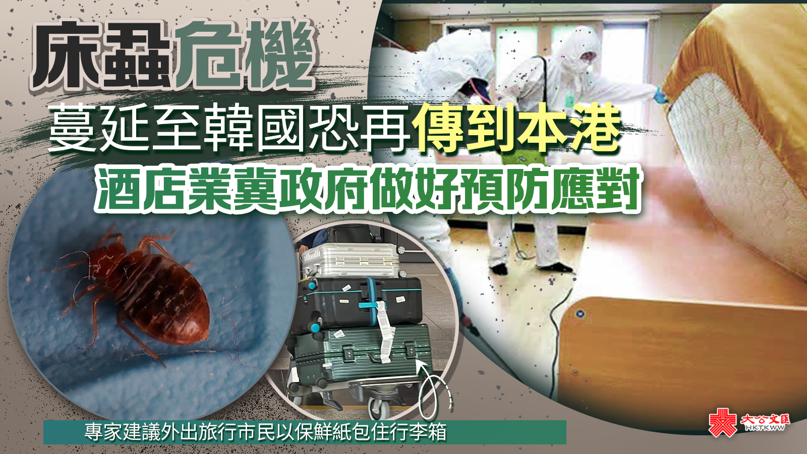 大公文匯全媒體報道,床蝨危機先前在英國、法國等地蔓延,現已傳到韓國,包含首爾、仁川等多個城市都爆出蝨患,遍及酒店、戲院等公共場所。由於韓國是港人的熱門旅遊地區,外界憂慮或會傳入本港。酒店業主聯會執行總幹事徐英偉今日(9日)出席一個電台節目時表示,業界十分重視有關情況,昨日與政府有關部門交流意見,業界會加強房間清潔,一旦發現有床蝨,有相關指引處理。