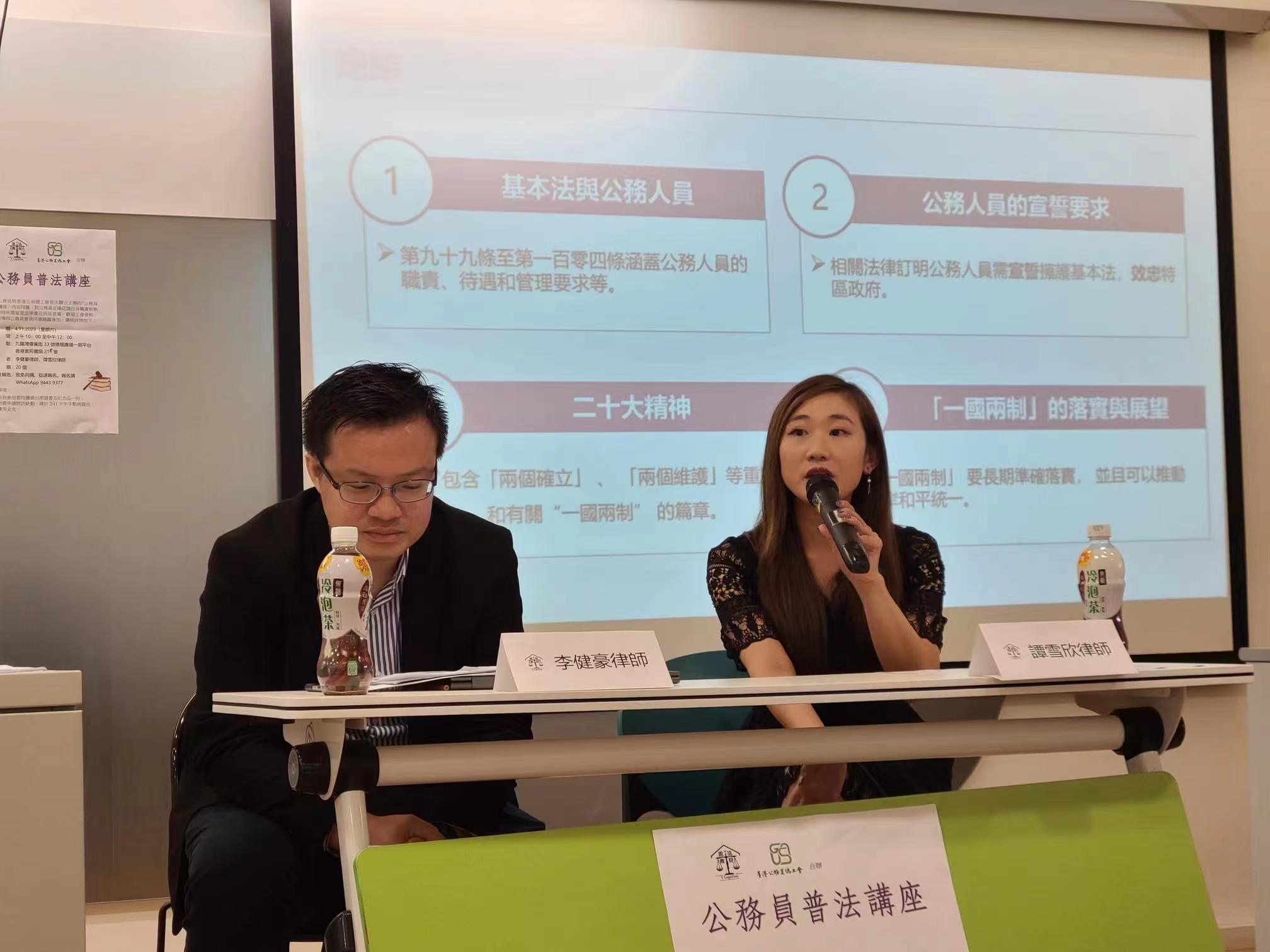 譚雪欣在她的講座部分與參與者詳細討論及分享基本法與公務人員的關係、如何正確理解「公務員政治中立」的要求,並就一宗公務員簽效忠聲明的司法覆核案件作出了深入交流。除此之外,譚雪欣對二十大報告就「一國兩制」的論述提供了個人的闡釋及見解。