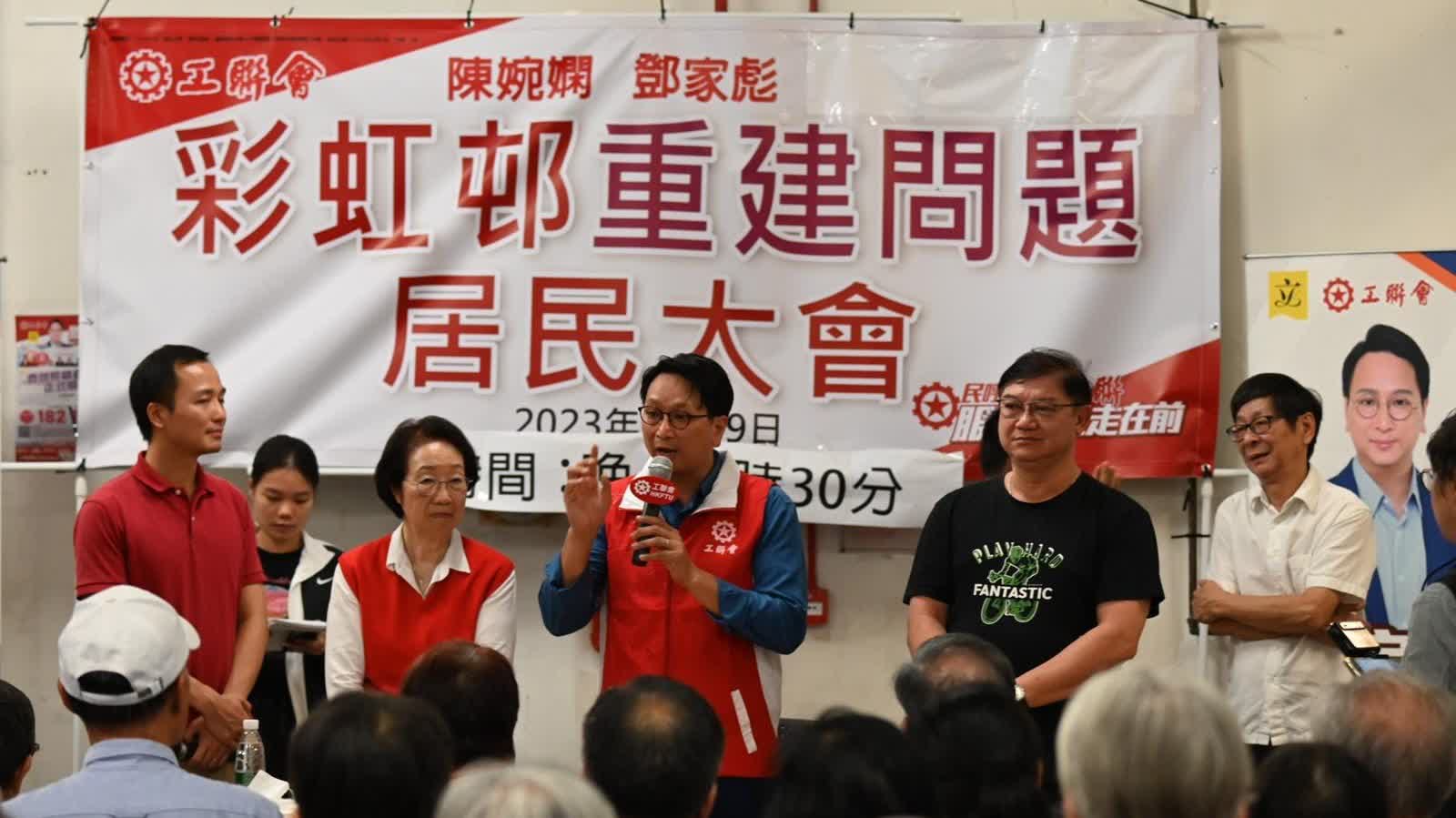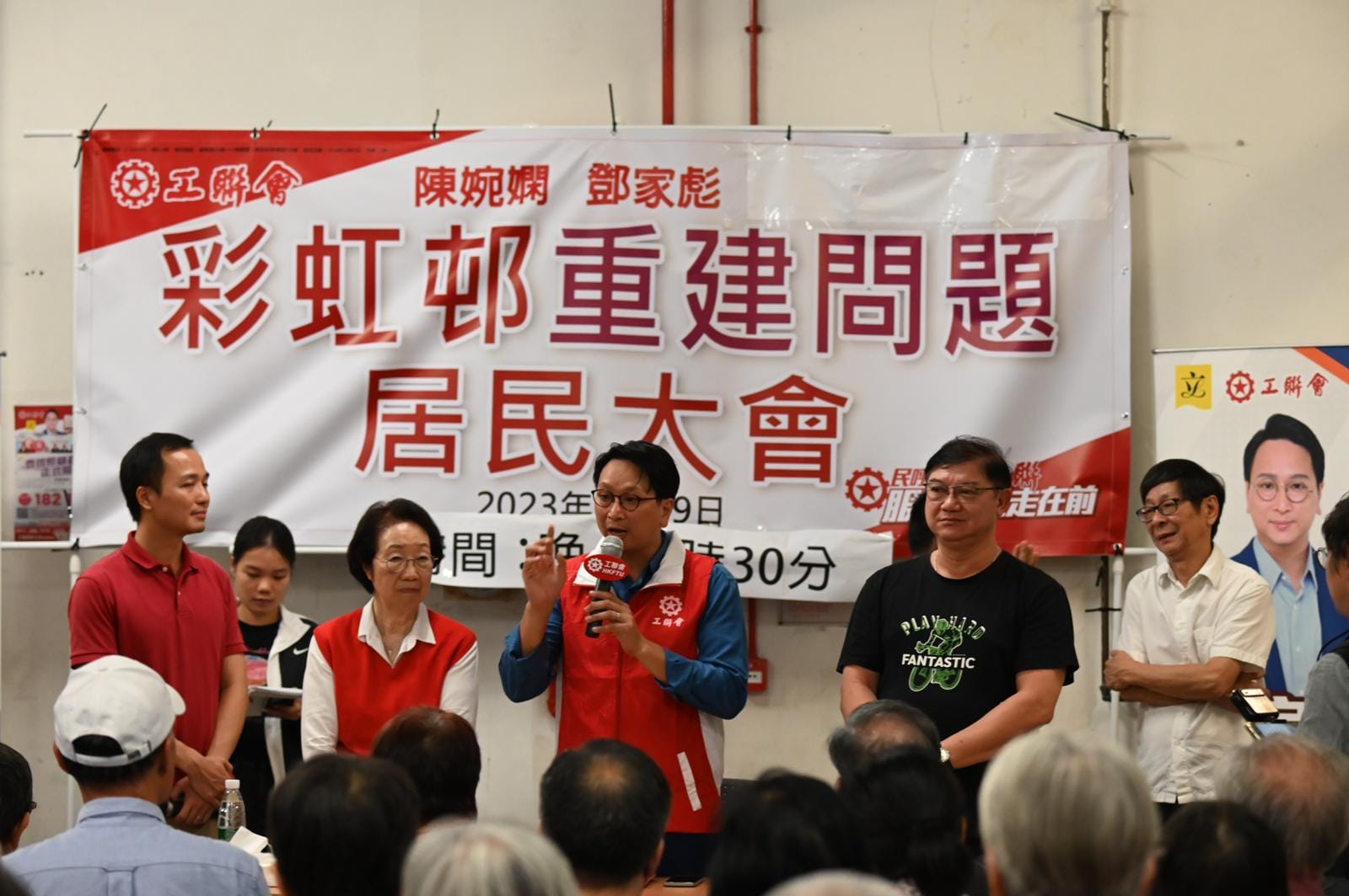 鄧家彪指,居民對重建非常緊張,但政府仍未正式確認是否選定彩虹邨進行重建,希望政府盡快公布決定,並優先照顧屋邨內的長者。工聯會將約見政府,反映居民意見。他又希望,重建期可壓縮至十年完工,並為居民提供搬遷津貼及派出關愛隊支援搬遷。