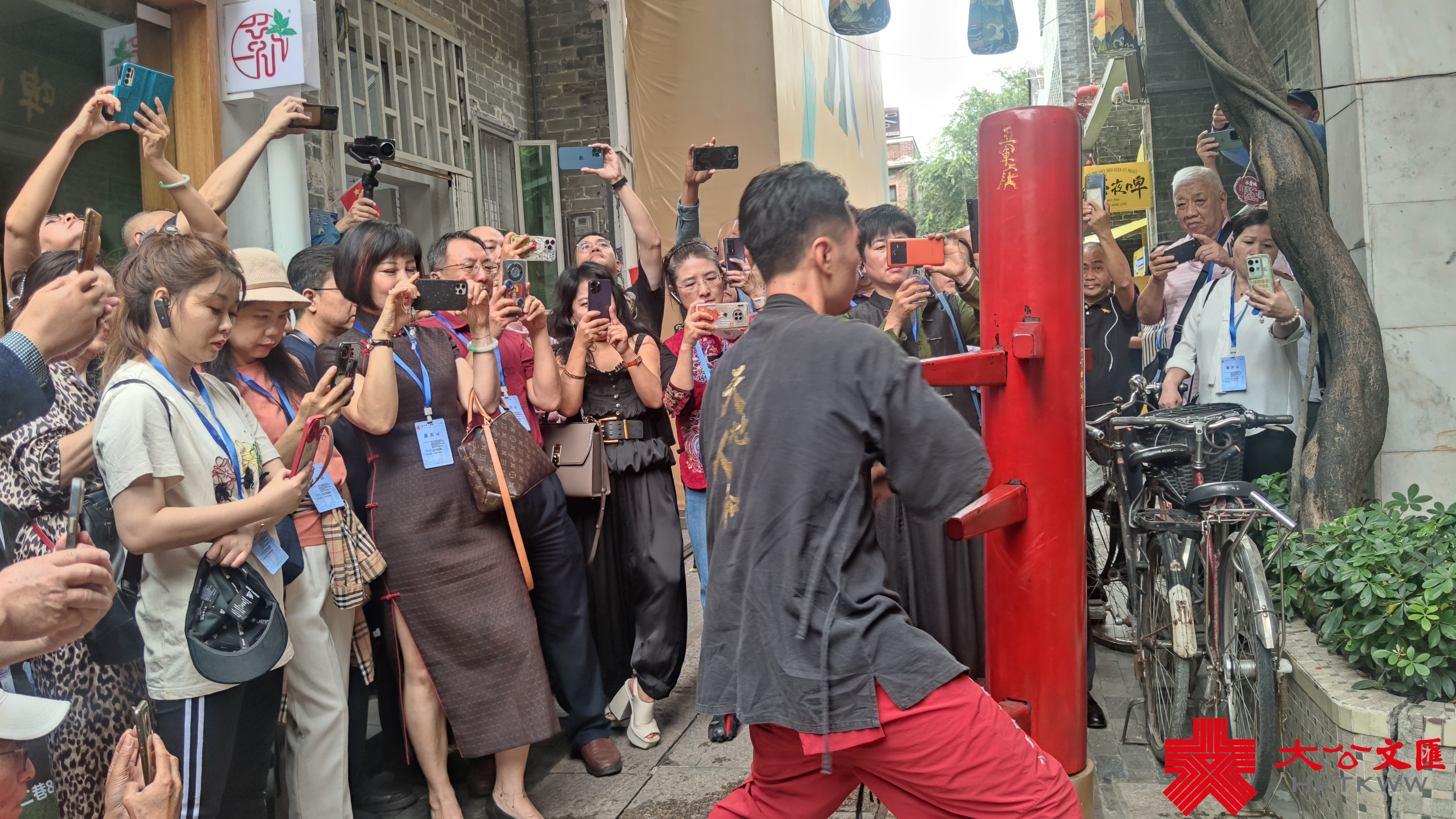 (大公文匯網 記者 敖敏輝)10日上午,2023海外華文傳媒合作組織廣東高質量發展主題調研團走訪了廣州非遺街區永慶坊。在粵劇武打行「鑾輿堂」,粵劇紅船木人樁108式傳承人、澳門國家級非物質文化遺產武術協會理事長李健豪,正帶領弟子練習詠春拳。「噔、噔、噔」,手臂與木樁鏗鏘有力的碰撞,吸引了一眾華媒高層。在李健豪的示範和帶領下,部分團員還親自上陣體驗。參與體驗的華媒高層說,拳腳之間,彰顯尚武精神,來到南派武術發源地一線體驗,非常過癮。