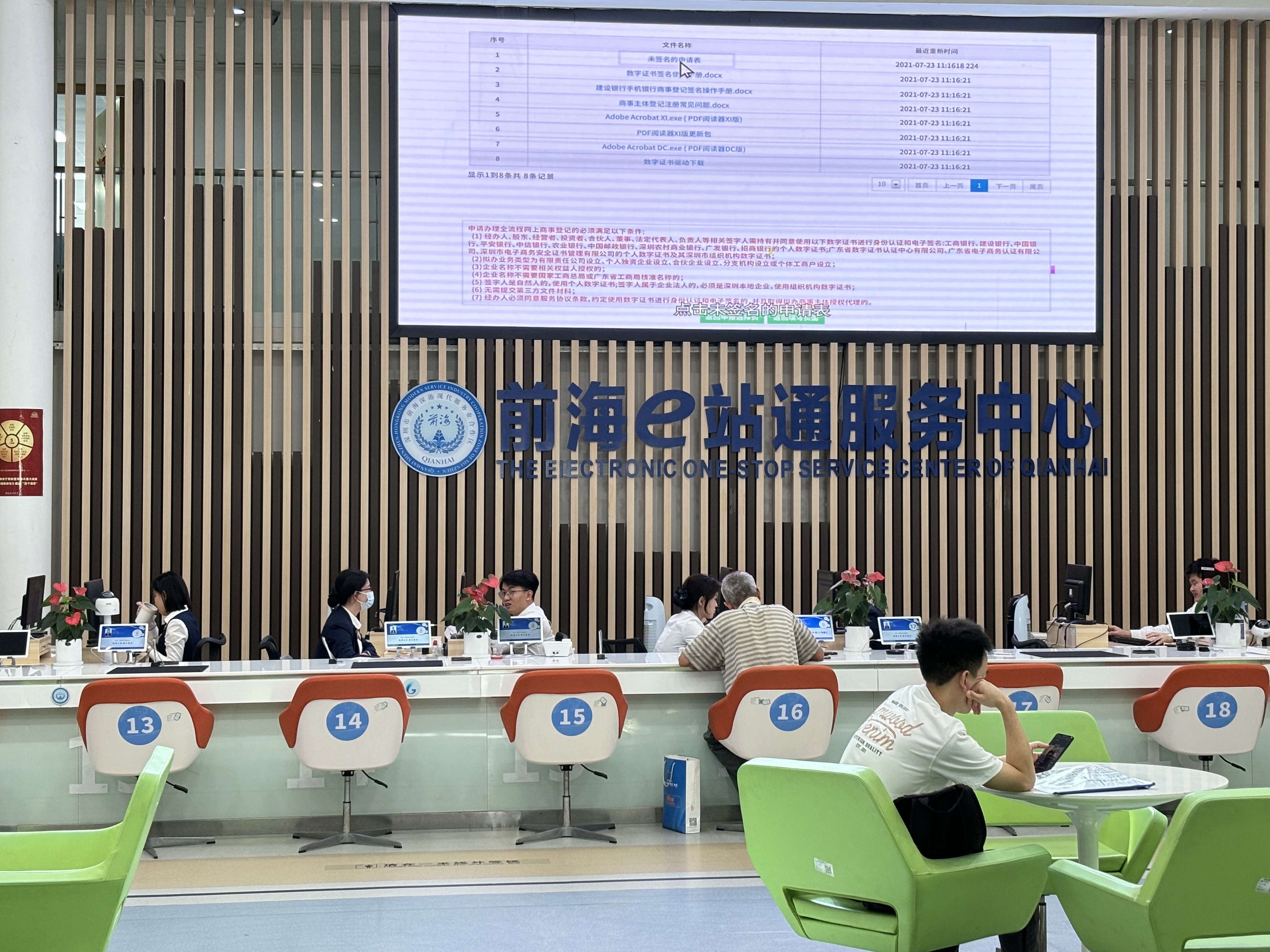 據介紹,前海e站通服務中心成立於2013年7月,是國內首個基於網絡應用的政務服務大廳。大廳內設有綜合服務大廳、自助服務區、企業開辦服務專區、重點(港澳)企業服務專區及商密服務、專業服務、便民服務三個專廳,服務窗口多達58個,包括市監局、前海稅務局、社保局、公積金中心、銀行等單位入駐,可辦服務事項518項,實現前海區域行政事項集中管理審批、資源集中共享、審批過程集中監管的行政審批創新,為辦事人員提供規範、高效、便捷的一站式政務服務。