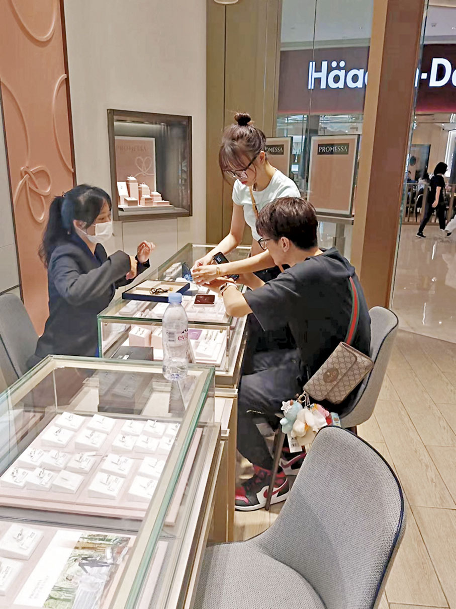 在商場內的港資珠寶店周大福和周生生,兩家店均推出不少優惠。周大福店員表示,「雙十一」期間一件珠寶88折,黃金產品每克減20元,強調這個優惠是平時沒有的。記者看到一對講粵語的年輕夫婦,在等待店員幫其穿黃金珠子項鏈。有店員透露,客人來自香港,購買了大概一兩萬元人民幣的金飾。因為「雙十一」期間香港商家優惠沒有深圳大,因此他們店舖吸引了不少港人前來購買。