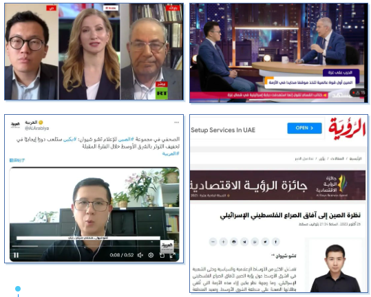 總台多位駐中東地區記者先後15次以演播室對話、視頻連線訪談、發表署名文章等方式,走進今日俄羅斯電視台阿拉伯語頻道、沙特阿拉伯阿拉比亞電視台、埃及開羅新聞電視台、阿聯酋7eNEWS新聞網、阿曼《觀點報》、巴勒斯坦新聞網等多家中東主流媒體,在衝突核心地帶及周邊地區發出中國媒體聲音。