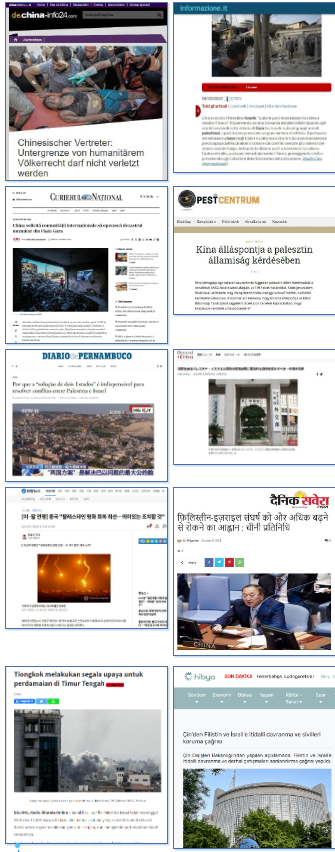 多語種發布中方表態。總台接連發出《中國外交部回應巴以衝突升級:呼籲有關各方保持冷靜克制 立即停火》《中方代表:國際人道法規定的紅線不容觸碰》等多語種系列報道,被德國、意大利、巴西、葡萄牙等12個歐洲拉美地區國家的36家主流媒體,以及日本、韓國、印度、印度尼西亞、土耳其、巴基斯坦等亞非國家的200多家媒體轉載。