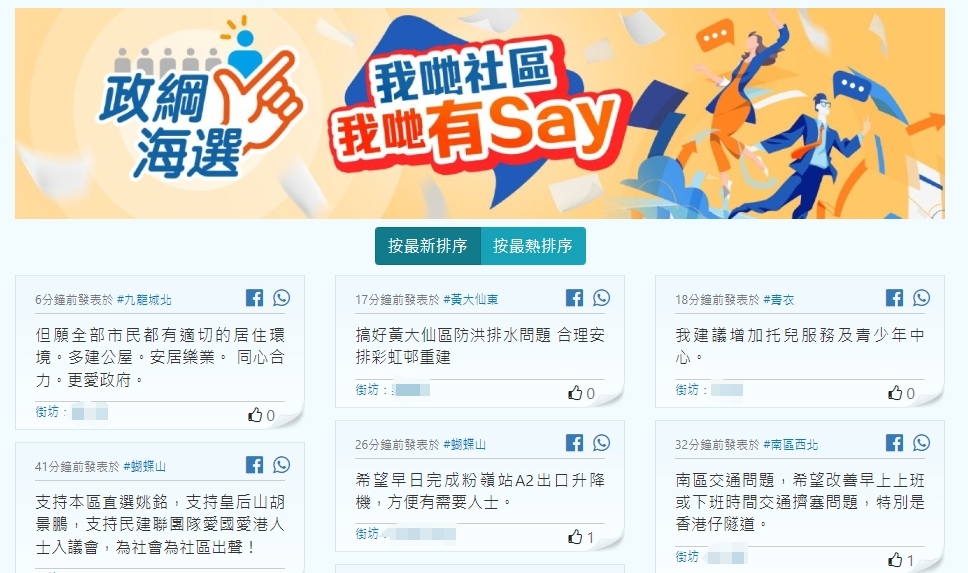 大公文匯全媒體報道,2023年區議會一般選舉的提名期10月17日展開,至10月30日結束,399名候選人提名全獲區資會裁定有效。現時各地區都不停有候選人在街上與市民親身接觸,宣傳政綱。近日,網上出現「政綱海選」平台,以「我哋社區我哋有Say」為口號,收集市民對社區及未來區議員的意見。