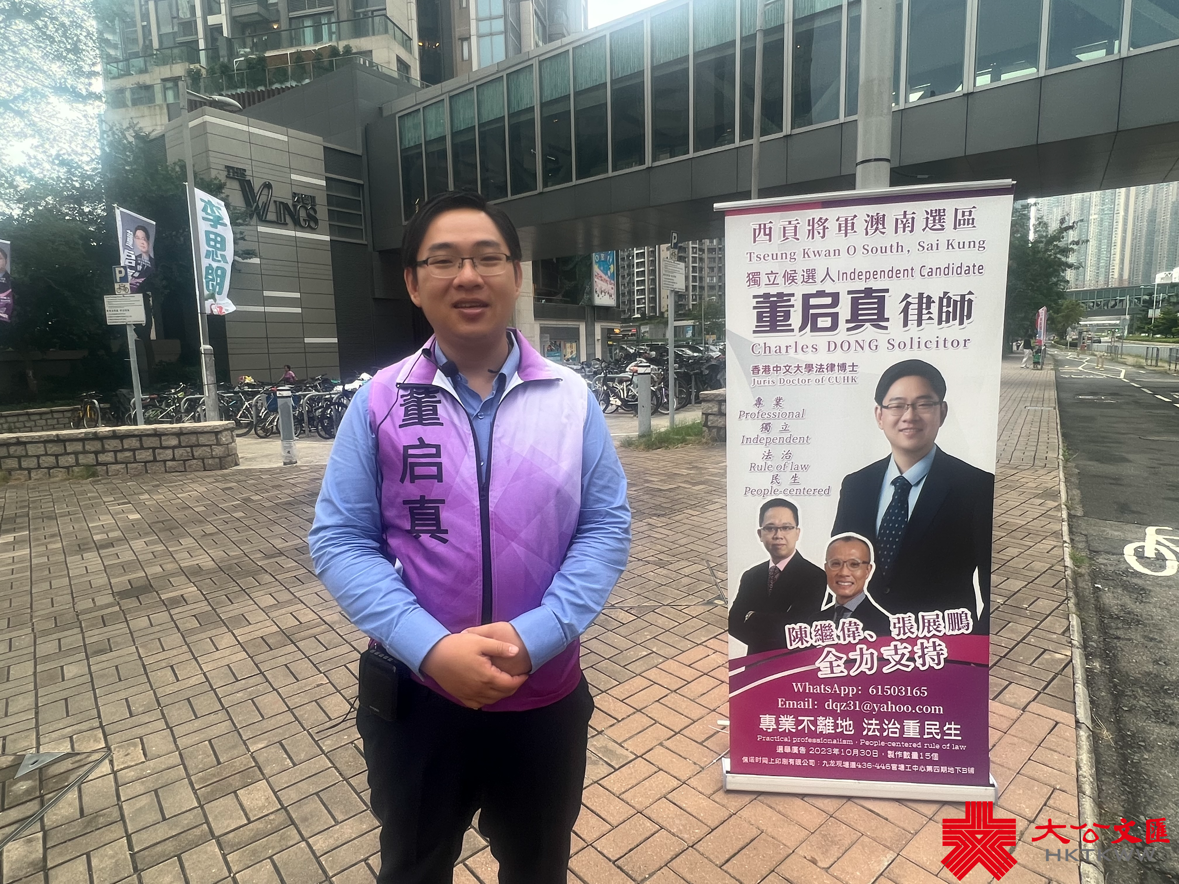 董启真作為律師,是第一次參選,獲立法會議員林素蔚到場支持。「我是獨立候選人,想在街坊和律師界做一個橋樑,讓他們更接觸到專業服務。」他表示,常年會有市民向他徵求法律意見,雖然這幾天他不適宜直接給出行業建議,但日後都有義務堅持在法律層面服務社區。」談及對此次選舉的印象,他表示現在參選是「在一個好的時機,做對的事」,表示候選人之間是「君子之爭」,拚的是政綱。