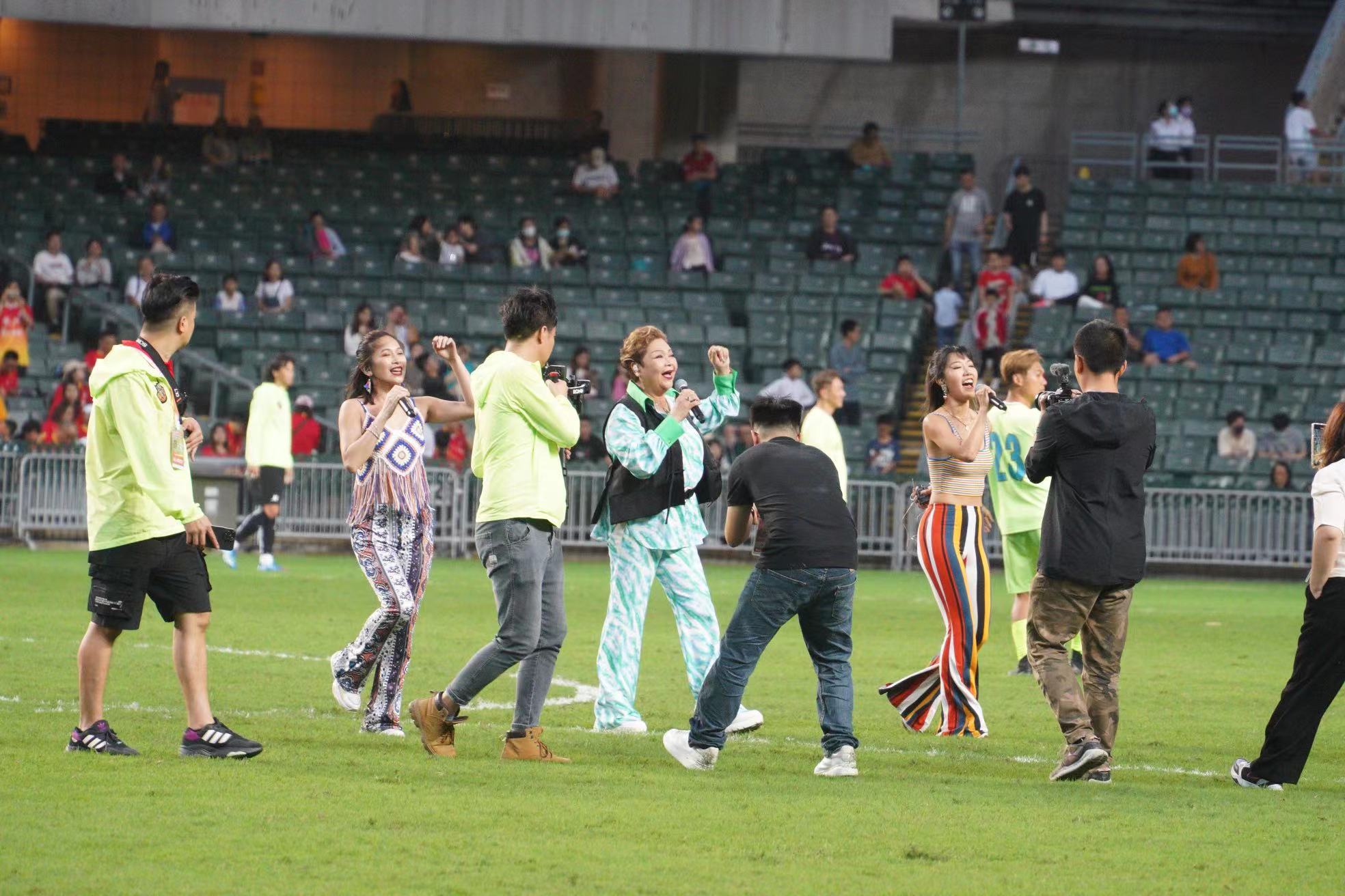 上半場,比賽開場不足10分鐘,榕江村超聯隊率先取得進球,1比0領先香港明星足球隊,但隨後榕江村超聯隊送上「大禮」,誤入烏龍球,兩隊打成1比1平。