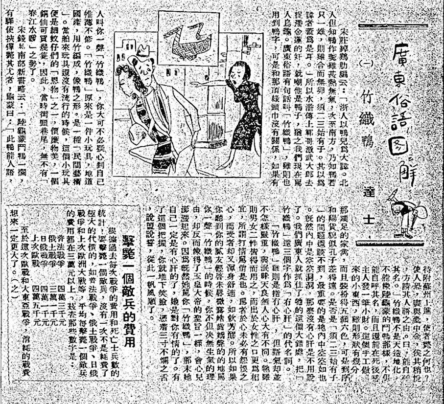 負責為《廣東俗語圖解》畫插畫的畫家鄭家鎮,後來在《我認識的戴望舒》一文中提到:「他說的是帶有上海音鼻音又很重的廣東話,在香港寄居了十多年,上海音還脫不掉。」由此可見,戴望舒會聽說廣東話,雖然不標準。在《廣東俗語圖解》中,他以詼諧有趣的敘述,對「竹織鴨」「沙爛磞」等民間俗語的來歷進行考證,又對其意義進行解讀,妙趣橫生。比如他談及,「沙爛磞」被廣東人認為是日語,又被日本人認為是廣東話,於是去考證,發現是一個廣東小夥子不標準的日語而造出的詞,引起了誤會。在這篇文章中,戴望舒也針砭時弊,認為這一詞彙可以看出「中日親善」的影子:「我們現在才開始做的事,它在六七十年之前就做到了。所以我們可以斷然說:日華二國的友善以及密切合作,是從『沙爛磞』說始的。」