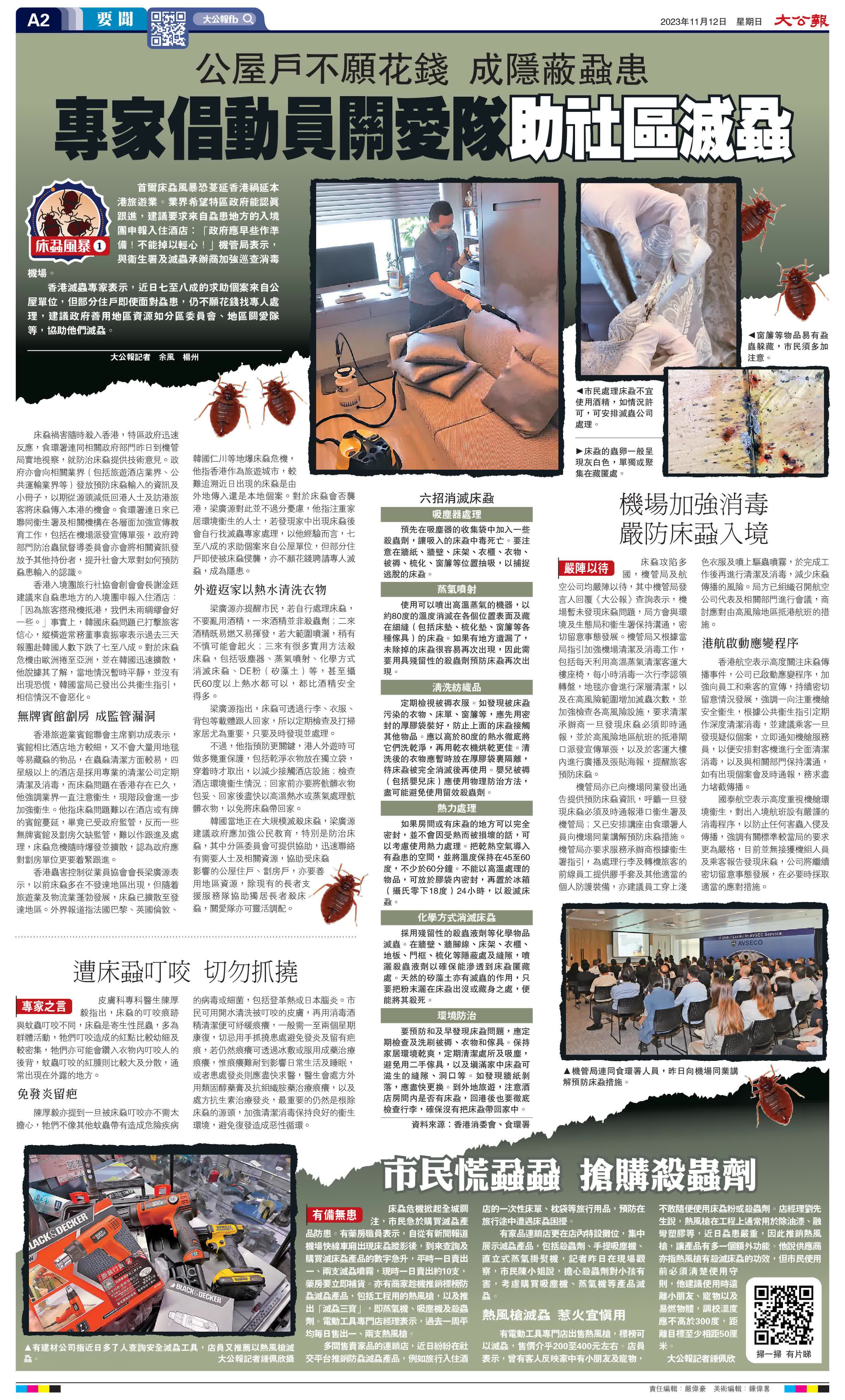 (大公報記者 余風 鍾佩欣 楊州)首爾床蝨風暴恐蔓延香港禍延本港旅遊業。業界希望特區政府能認真跟進,建議要求來自蝨患地方的入境團申報入住酒店:「政府應早些作準備!不能掉以輕心!」機管局表示,與衞生署及滅蟲承辦商加強巡查消毒機場。