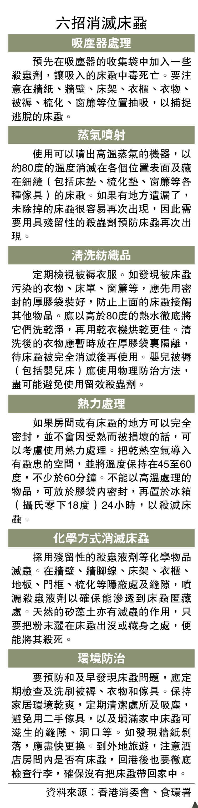 不過,他指預防更關鍵,港人外遊時可做多幾重保護,包括乾淨衣物放在獨立袋,穿着時才取出,以減少接觸酒店設施;檢查酒店環境衞生情況;回家前亦要將骯髒衣物包妥、回家後盡快以高溫熱水或蒸氣處理骯髒衣物,以免將床蝨帶回家。