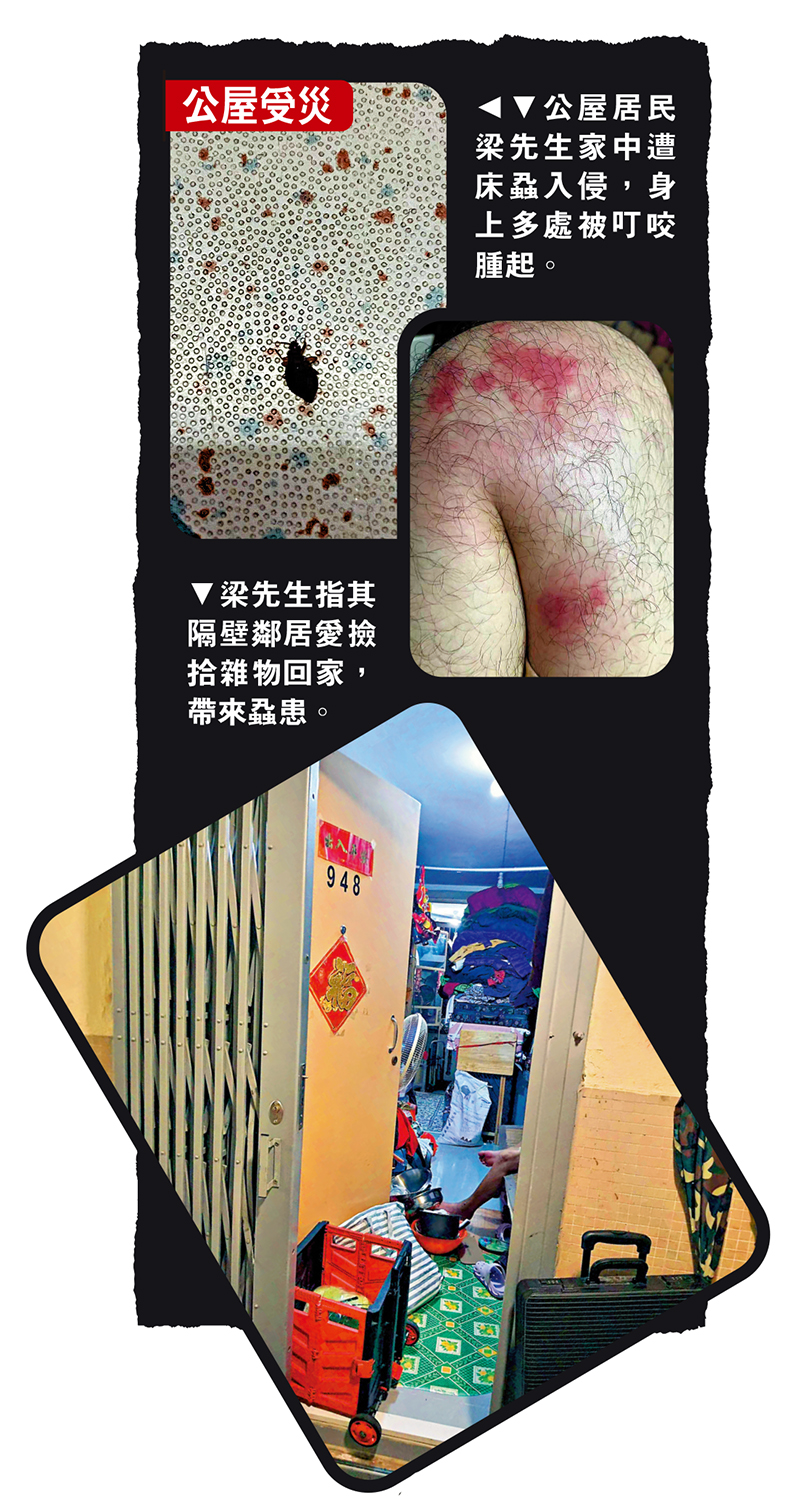 梁先生被蝨叮咬,痕癢不能入眠,翌日又因睡眠不足而影響工作,「鄰居拾垃圾回家時,蝨跳進我家,附近鄰居都被床蝨入侵,他家裏已蝨滿為患,不時會見到蝨,到夜晚會跳出走廊。我身上多處出現大面積的叮咬紅腫,且痕癢難耐。」他曾多次向房屋署投訴,房署僅派人清理公眾走廊便了事,隔壁單位卻從沒有清理,「房署主任坐在怪鄰居的家裏家訪十多分鐘,便說沒有任何異味、曱甴及床蝨。」梁先生日前自費逾千元聘請滅蟲公司在家滅蝨,但他擔心床蝨隨時捲土重來。