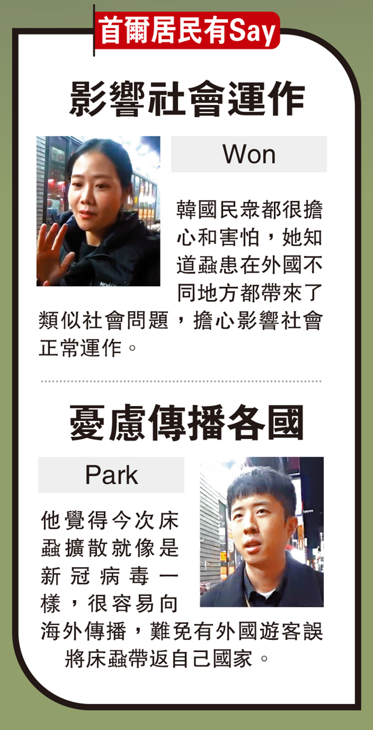 另一市民Park表示,對於歐洲疑有床蝨向海外擴散感到頗驚訝,早前曾在網上得知床蝨在巴黎肆虐,感到可怕。他曾聽過其祖母提過,韓國以前亦曾爆發床蝨,之後已經撲滅。