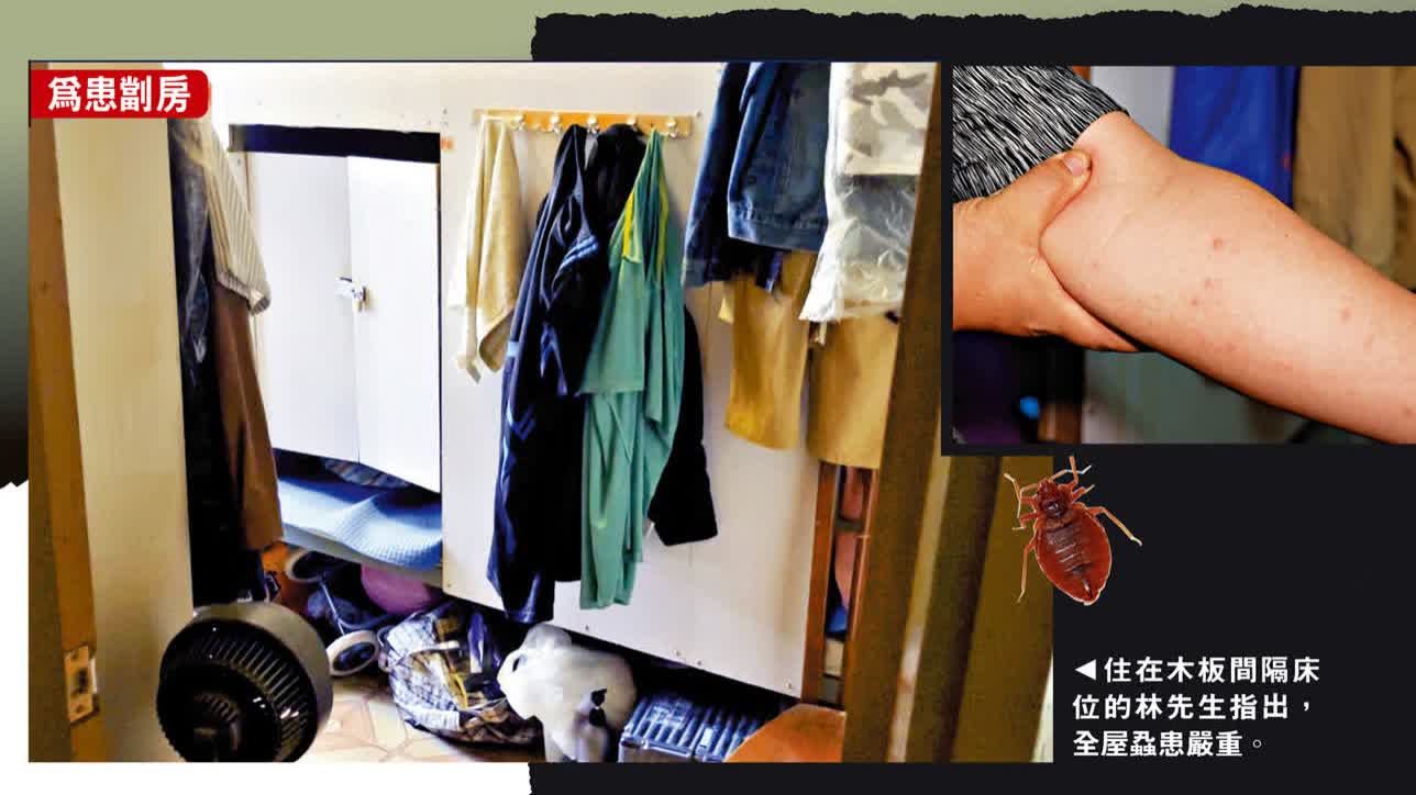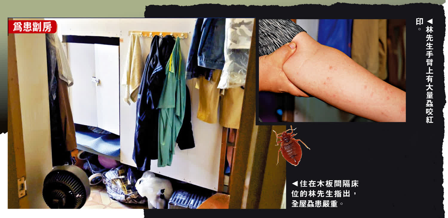 兩年多以來住在長沙灣僅一人身位闊的木板床位,林先生表示,他與其他住客均日夜飽受床蝨侵擾之苦,「在這住多久就被蝨咬多久,幾乎每晚都睡得不好,影響了工作。」雖入冬後床蝨相對不活躍,惟他每晚睡覺時仍被蝨叮咬手腳,床蝨有時會從衣物鑽進後背,愈用手搔反而愈癢,所以要每日搽類固醇藥膏紓緩痕癢。