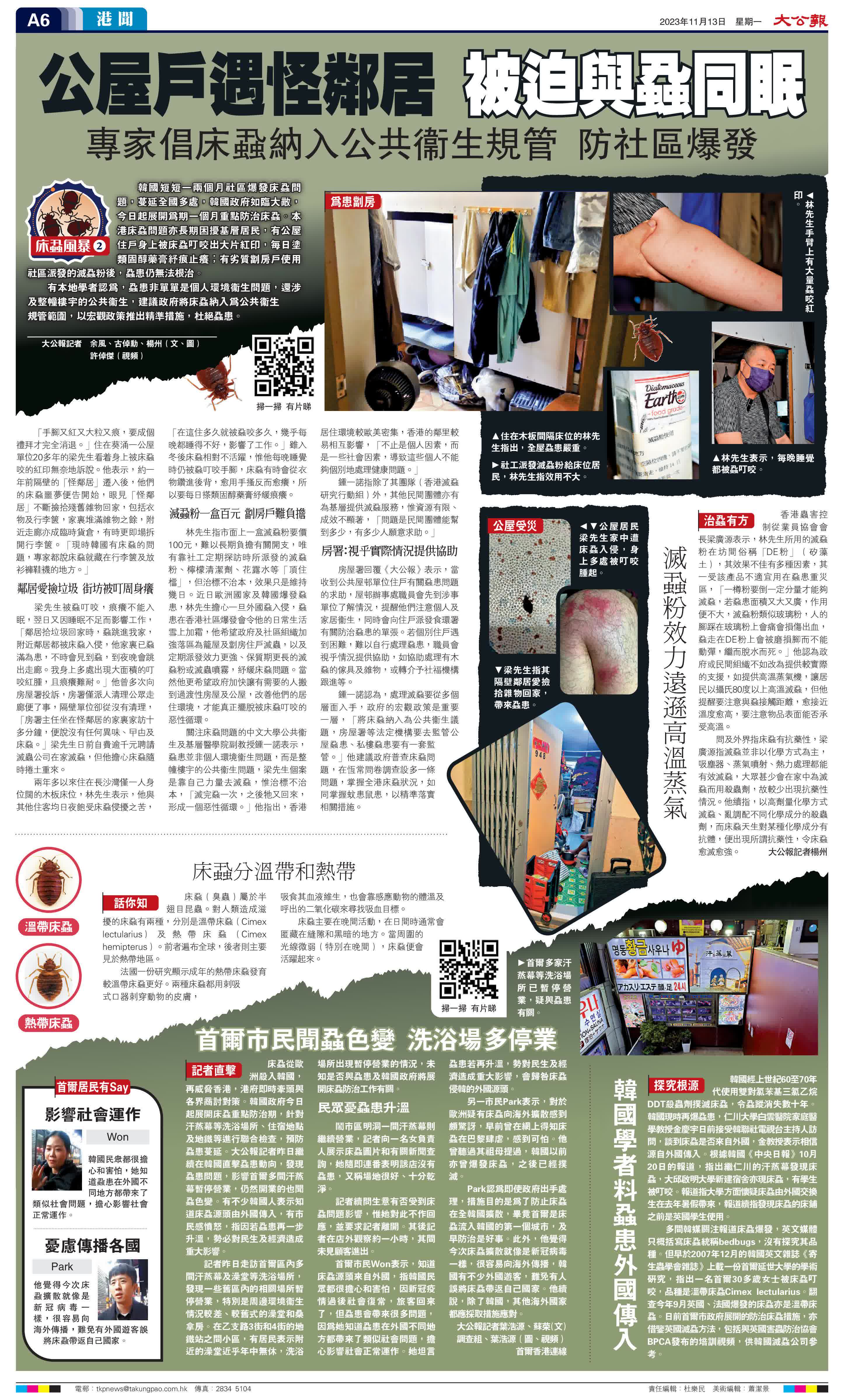 (大公報記者 葉浩源、蘇荣、余風、古倬勳、楊州<文> 調查組、葉浩源、許倬傑<圖、視頻>)韓國短短一兩個月社區爆發床蝨問題,蔓延全國多處,韓國政府如臨大敵,今日起展開為期一個月重點防治床蝨。本港床蝨問題亦長期困擾基層居民,有公屋住戶身上被床蝨叮咬出大片紅印,每日塗類固醇藥膏紓痕止癢;有劣質劏房戶使用社區派發的滅蝨粉後,蝨患仍無法根治。