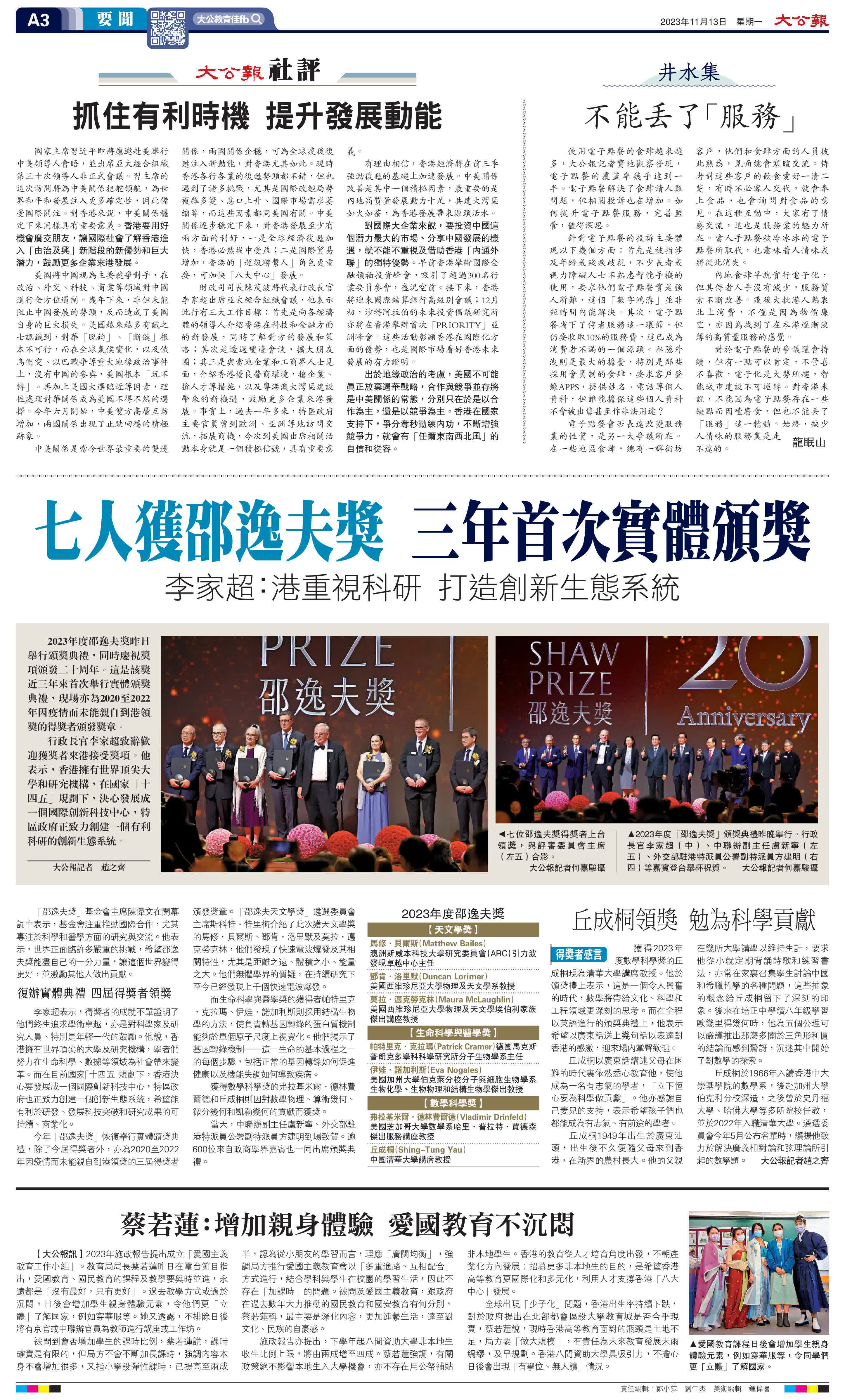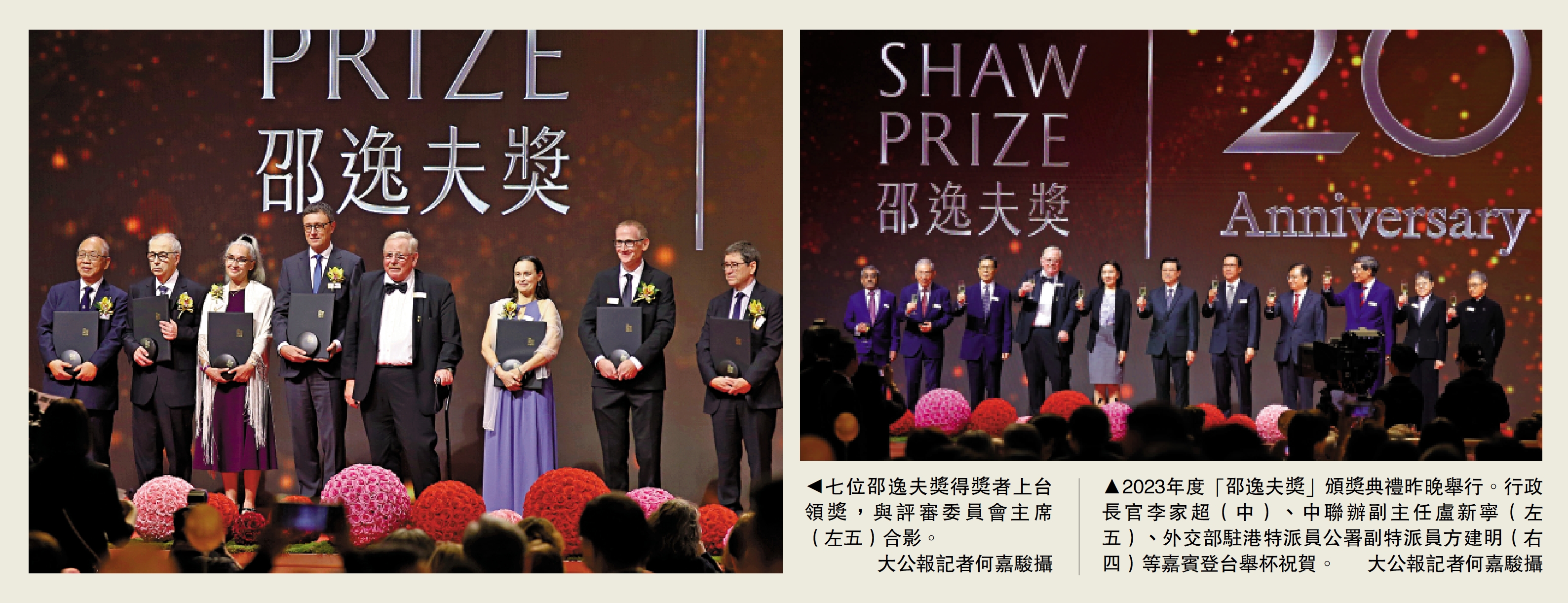 (大公報記者 趙之齊)2023年度邵逸夫獎昨日舉行頒獎典禮,同時慶祝獎項頒發二十周年。這是該獎近三年來首次舉行實體頒獎典禮,現場亦為2020至2022年因疫情而未能親自到港領獎的得獎者頒發獎章。