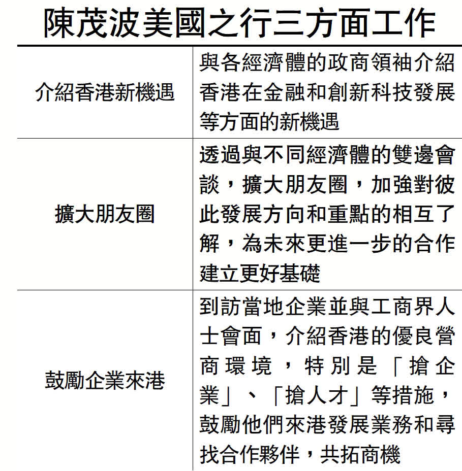 第二是,透過與不同經濟體的雙邊會談,擴大朋友圈,加強對彼此發展方向和重點的相互了解,為未來更進一步的合作建立更好的基礎。第三,計劃到訪當地企業並與工商界人士會面,介紹香港的優良營商環境,特別是在推動金融、創科和其他產業蓬勃發展的策略;「搶企業」、「搶人才」等措施,以及粵港澳大灣區和整個內地的商機和潛力,鼓勵美國企業來香港發展業務和尋找合作夥伴,共拓商機。