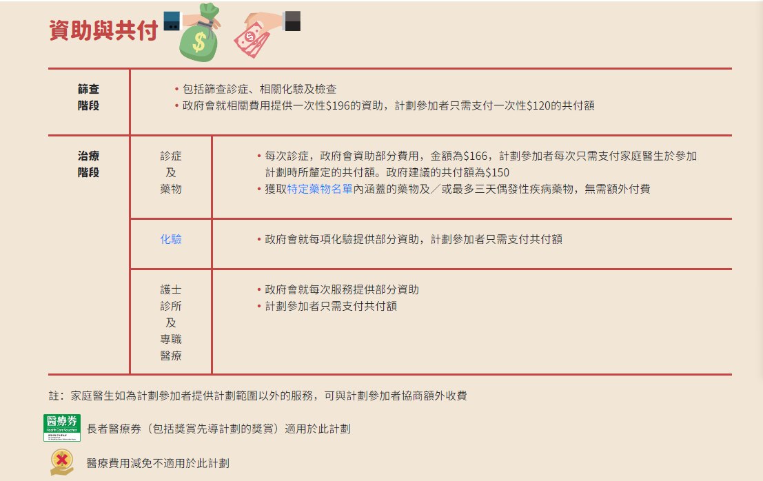 - 患有高血壓及/ 或糖尿病的計劃參加者每年會由家庭醫生提供最多六次受資助診症,而血糖偏高者則會獲提供每年最多四次的受資助診症,及提供所需藥物;